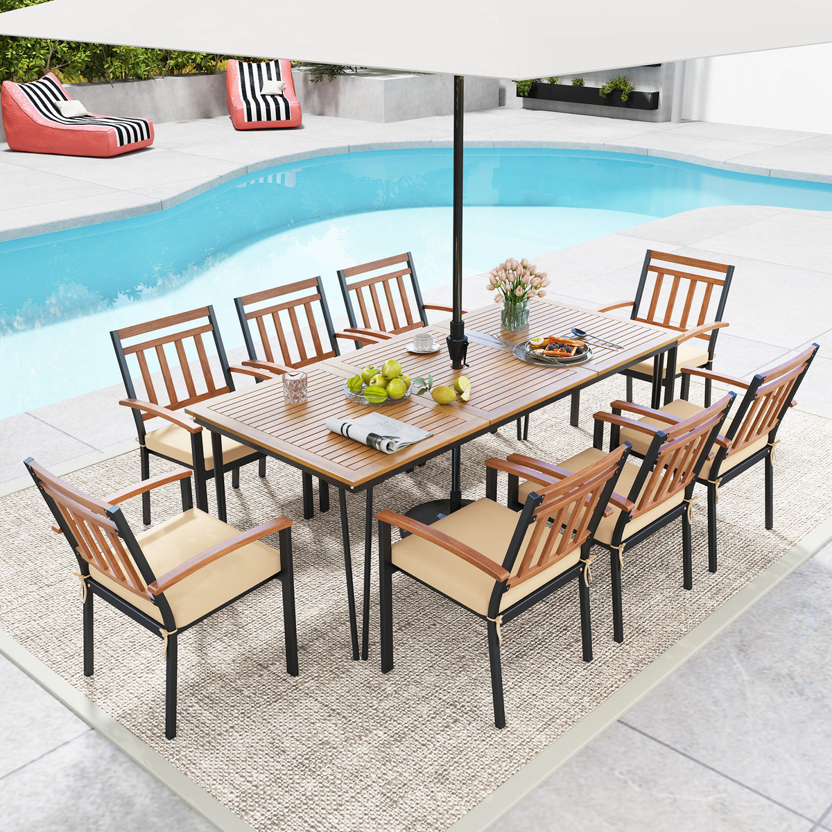 Colour: Natural and Black Material: Acacia Wood, Metal Overall Dimension: 200 x 90 x 75 cm (L x W x H) Diameter of Umbrella Hole: 5 cm Thickness of Wooden Tabletop: 1.8 cm Max Load Capacity: 75 kg Net Weight: 23 kg Box Qty:1(May vary by batch)Package Includes: 1 x Outdoor Dining Table 1 x User Guide