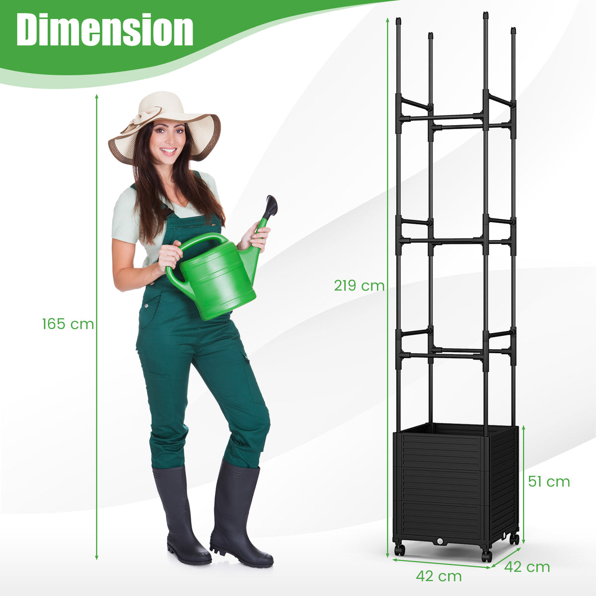 Why you choose this planter box with trellis? The garden bed features a customized trellis with removable metal tubes to provide 3 heights. And each PE-coated metal tube is anti-scalding and rustproof. The planter box provides versatility with adjustable heights of 51 cm, 37 cm and 23 cm, making it suitable for various plant roots. No more frequent watering, the self-watering design with drainage holes provides more convenience and can keep your plants healthy. With built-in universal wheels for easy mobility and stability, 2 of which are lockable, this extendable garden bed allows for multiple units to be combined for larger planting areas. Assembling the bed is hassle-free with no screws required, and a pair of gloves is included for hand protection. If you are looking for a Raised Garden Bed like this, do not hesitate to place an order! Customized Trellis: The vertical trellis consists of ample removable metal tubes that provide 3 different height and enable you to freely decide the space arrangement. In addition, they are PE-coated to avoid scalding plants and enhance rust resistance. 3-Height Garden Bed: Tailor your gardening experience with the adjustable planter box that provides heights of 51 cm, 37 cm and 23 cm, while accommodating various plant sizes and root depths. Besides, it is made of premium PP and ensures ideal longevity. Self-Watering Feature: Cultivate your green thumb with the garden bed, featuring an innovative self-watering system to sustain your plants’ thirst effortlessly. Moreover, it has side drainage holes to make drainage and filling with clean water easier. Simple Movement: Position the vertical planter tower anywhere, anytime with the convenience of built-in universal wheels, 2 of which are lockable. As you want, it can be a mobile gardening addition to refresh your indoor or outdoor living space. Extendable Design: As needed, it is feasible to buy more garden beds and combine them to build a large climbing area for your tomatoes, grapes, cucumbers, and more. Furthermore, it only needs a screw-free assembly and comes with a pair of gloves for optimal hand protection.