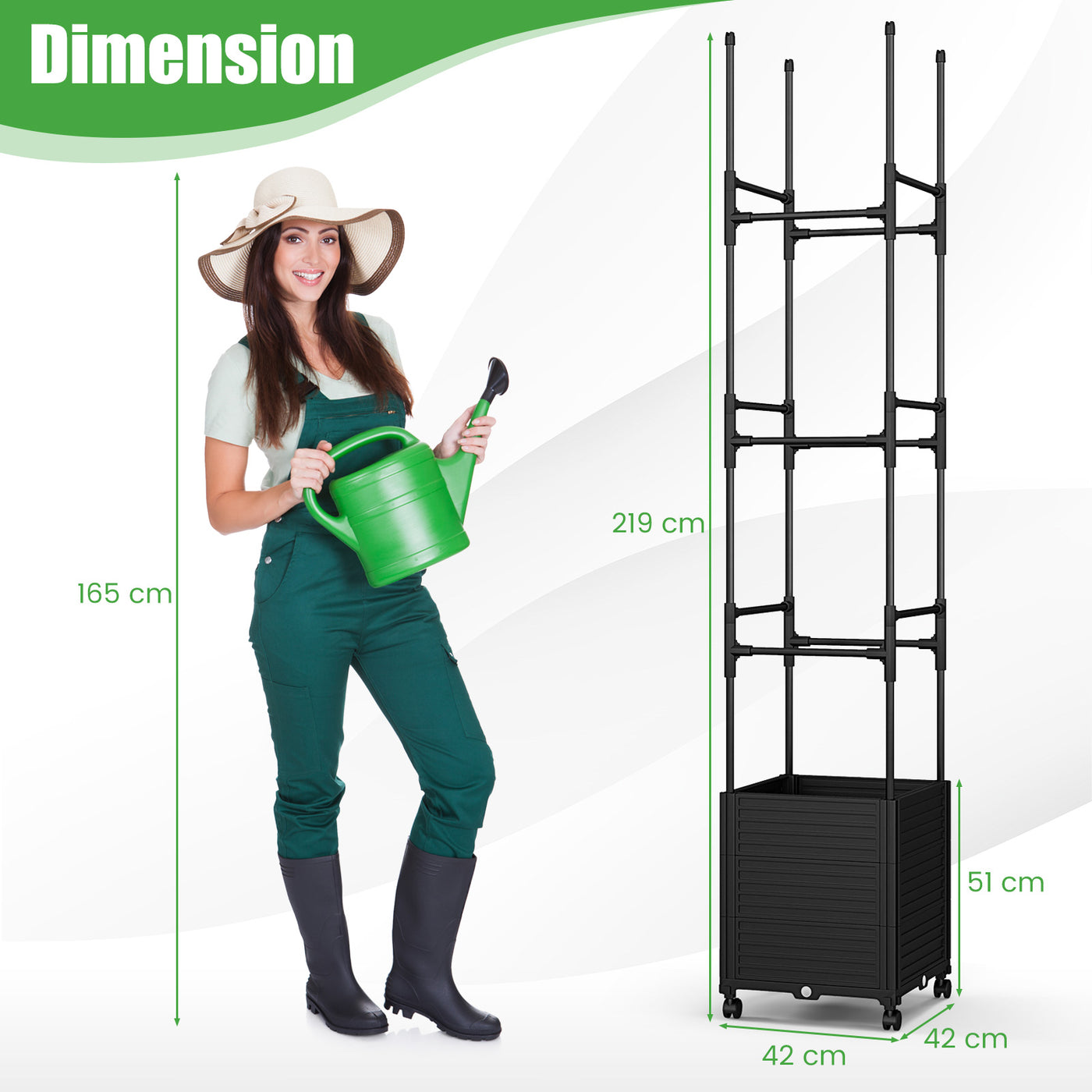 Colour: Black Material: PE-Coated Metal, PP Overall Dimensions: 42 x 42 x 219 cm (L x W x H) Optional Height of Planter Box: 51 cm, 37 cm, 23 cm Optional Height of Trellis: Capacity of Planter Box: 70 L Net Weight: 6.5 kg Box Qty:1(May vary by batch)Package Includes: 1 x Planter Box with Trellis 1 x Pair of Gloves 10 x Fixation Straps 1 x Instruction Manual