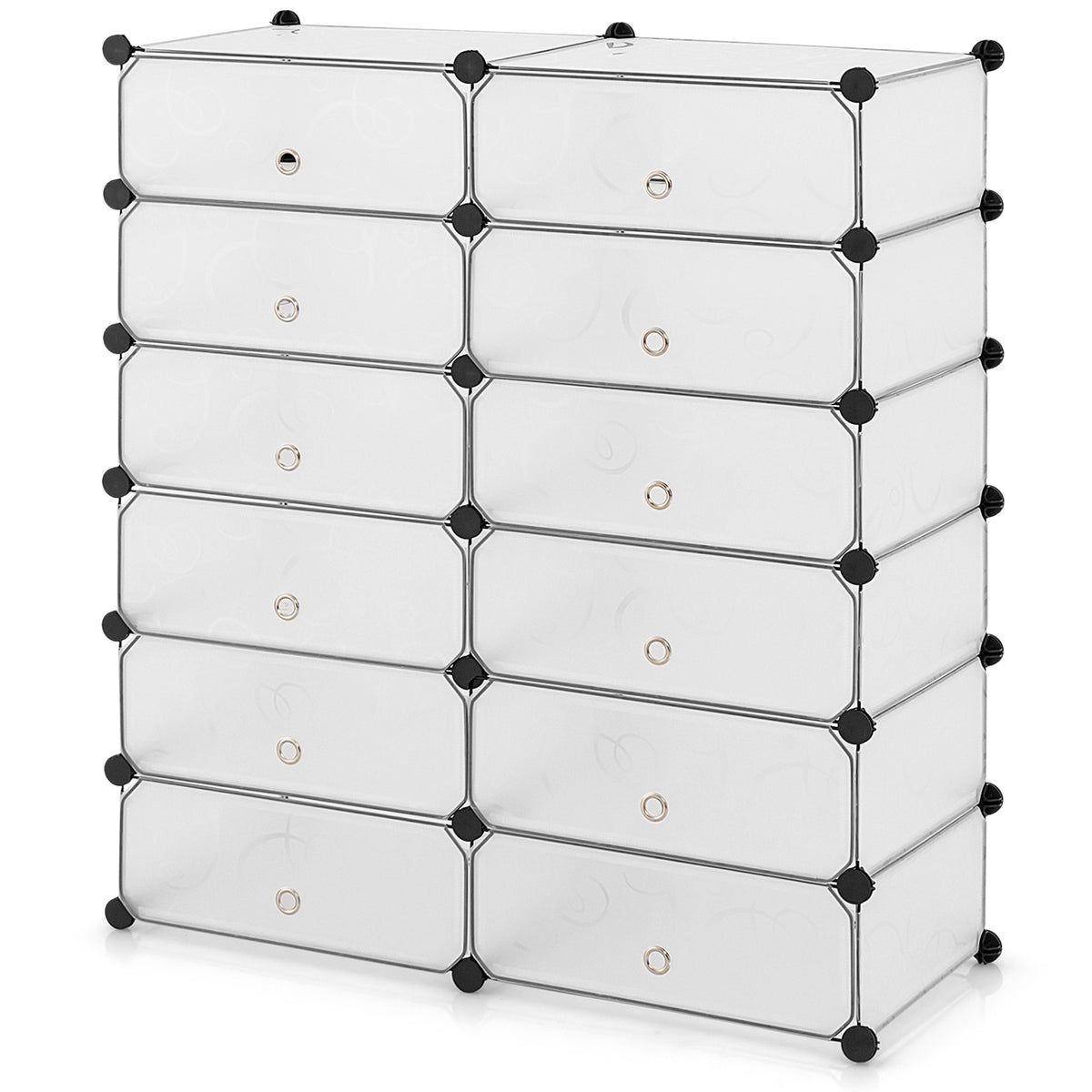 Not only can it accommodate your footwear collection, but it's also versatile enough to organize various items like clothes, toys, books and hats. Plus, this shoe rack provides the flexibility you need with its diverse combination patterns. Assembly is a breeze with the detailed instruction and user-friendly design. The exquisite panels add a touch of elegance to your living space, while the waterproof surface and dust-proof doors make cleaning effortless. Crafted with durable materials and sturdy construction, this shoe rack ensures your shoes and belongings stay securely in place, making it a reliable and long-lasting storage solution. If you are looking for a shoe rack like this, do not hesitate to place an order! Large Storage Space: This shoe rack comes with 12 large cubes, providing ample storage space to hold 24 pairs of shoes in normal size. Besides, you can use it to organize various items such as clothes, toys, books, and hats. Flexible Use and Customized Shape: The parts of the shoe cabinet can be easily disassembled, allowing you to easily DIY and create a configuration that suits your space and preferences. Moreover, the doors can be opened from up or down upon your installation method. Sturdy Construction: Crafted from high-quality PP materials, this shoe rack is built to last. The durable connectors and sturdy frame provide exceptional stability and support, ensuring that your shoes and belongings are held securely in place. More Exquisite Details: The panels of this shoe rack designed with exquisite pattern enhance the aesthetic appeal of your living space. The waterproof surface and dust-proof doors make cleaning a breeze, keeping your shoe rack looking fresh and organized. Easy to Assemble: Thanks to the detailed instructions and user-friendly design, this shoe rack can be setup without hassle. Additionally, the included free wooden hammer serves to save you time and energy.