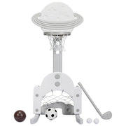 This stylish star basketball stand is great for developing hand-eye co-ordination. It will keep little ones active and help with social skills and physical co-ordination Basketball, football and golf are 3 of the top sports children like to play. This children's basketball stand with it's planet styled backboard, is height adjustable from 111cm to 151cm allowing the stand to grow with your child. The stand is suitable to be filled with sand or water to increase the stability of it. On the bottom, a football goal or golf net offers a change of sport. Teaching co-operation, competition and hand-eye co-ordination, this stand is a great way to introduce sports to your child. A perfect gift for children over 3 years old! 3-In-1 Basketball stand complete with: 1 basketball, 1 football, 1 golf club and 2 golf balls, 5 adjustable heights positions for the basketball net allows the stand to grow with your child Child Friendly Materials: Premium HDPE material is durable, environmentally friendly and odour free, offering the best protection for you little one. The sturdy base with smooth edges can be filled with sand or water to enhance its stability Learning while Playing: Can help develop children's hand-eye coordination, competition awareness and teamwork skills Easy Assembly & Store: With detailed instructions provided along with all hardware, assembling this stand is a breeze. Convenient to move from garden to living room or from playroom to bedroom. The only maintenance required is a damped cloth.