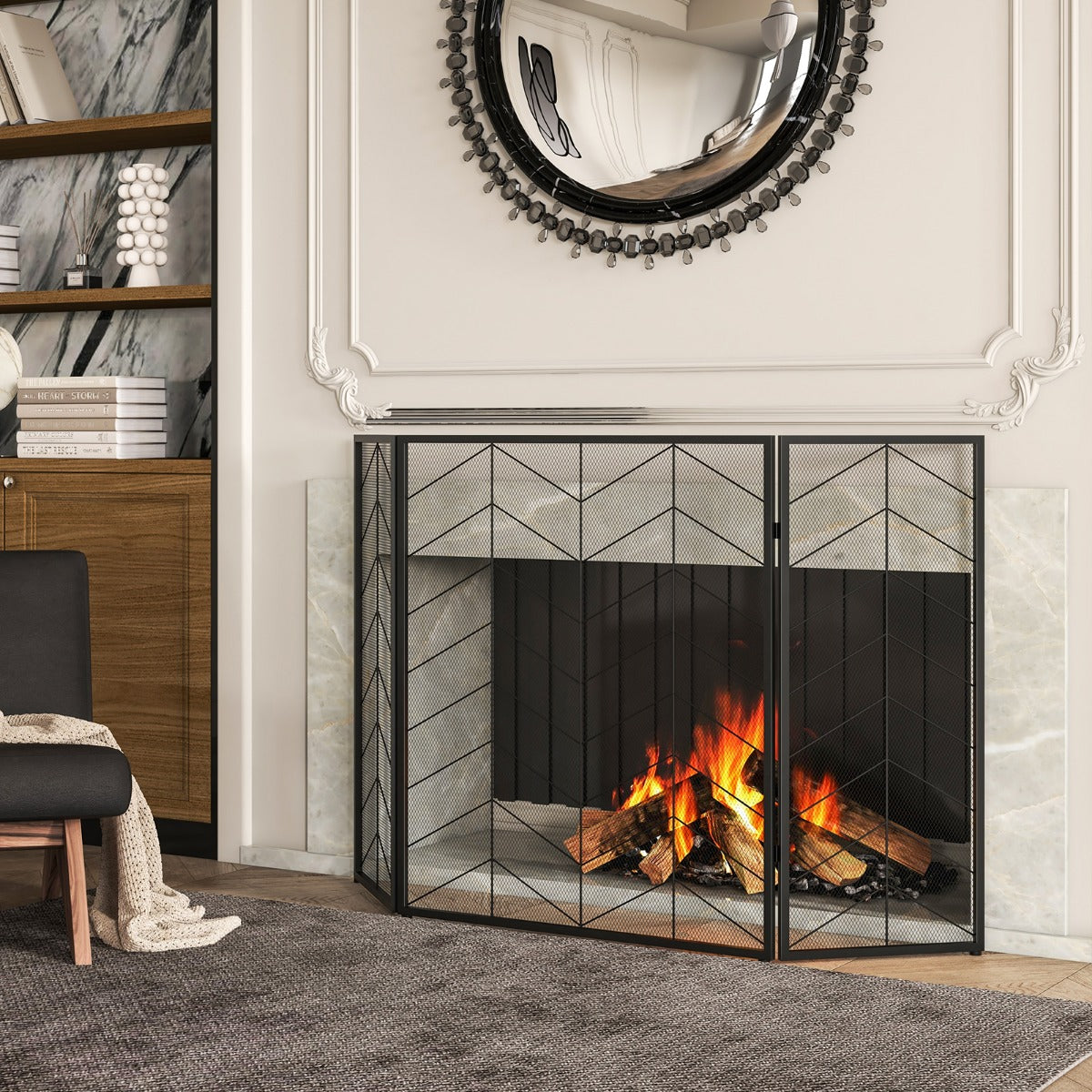 3-Panel Folding Spark Guard with Chevron Herringbone Pattern