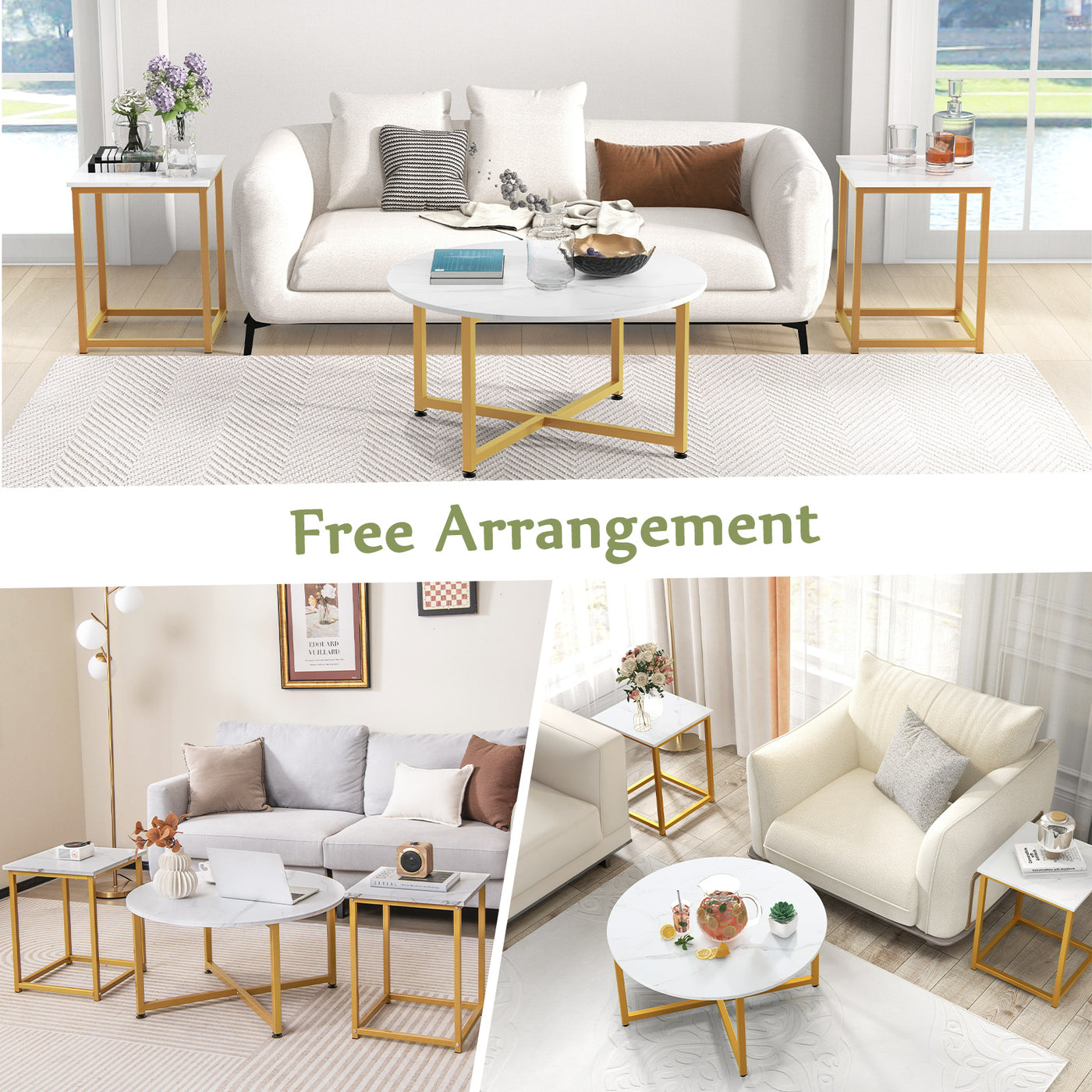 3-Piece Coffee Table Set with Heavy-duty Metal Frame-White