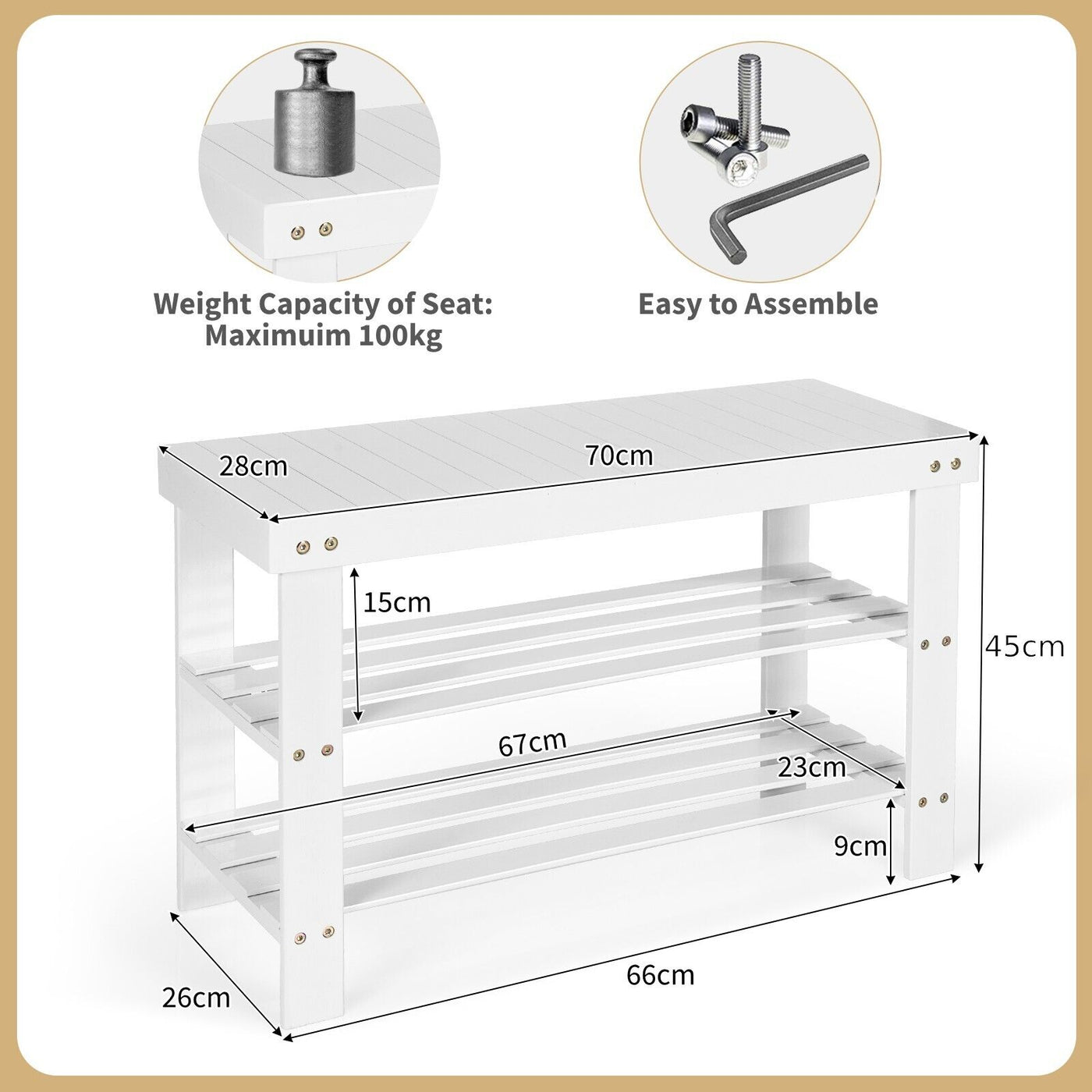 Material: Bamboo Product dimensions: 70 x 28 x 45cm (L x W x H) Shelf size: 67 x 23cm (L x W) Load capacity for the seat: 100kg Load capacity for each shelf: 10kg Net weight: 4kg Box Qty:1(May vary by batch)Package includes: 1 x Shoe rack 1 x Assembly instruction
