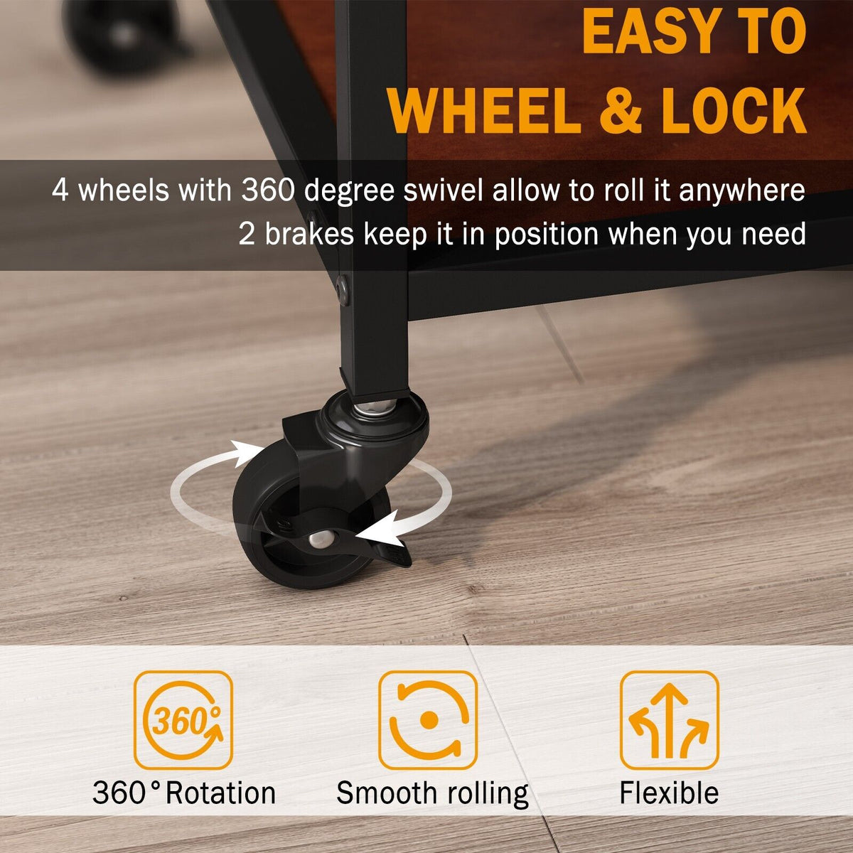 Made of premium engineered wood and heavy-duty metal frame, this bar serving cart is sturdy and durable enough to serve you for a long time. Equipped with 3 tier open shelves, 2 rows of glass holders and a 3-tier wine rack, this bar cart provides ample space to satisfy your storage needs. Besides, the guardrails on both sides of the wine rack can prevent the bottle from falling on the floor. Equipped with 4 smooth-rolling wheels, this cart can be moved anywhere easily. And 2 wheels are lockable, making it easy for you to stop the cart in a specific place stably. This 3-tier rolling storage cart is very suitable for kitchen, dining room, living room, bar, etc. Featuring an industrial style and simple design, this storage cart can fit well with any home decor. Ample Storage Space: This bar cart comes with 2 rows of glass holders and a 3-tier wine rack which can hold your wines horizontally and keep them fresh. The wooden tray at the top and the open shelves can be used to transport and store food, drinks or dining essentials. Moreover, the side rack can be used not only to hang towels but also as a push handle. Durable and Sturdy Construction: This kitchen bar serving cart is made of high quality engineered wood, making it sturdy and durable enough for long-lasting use. Besides, supported by a heavy-duty metal frame, this bar cart is strong enough to hold your kitchen and dining essentials or other items with a strong load capacity. Multifunctional Rolling Cart: With its excellent practicality, this multipurpose storage cart is perfect for kitchens, restaurants, hallways, bars or anywhere, keeping your floor space neat and tidy. Besides, 4 smooth rolling wheels (2 with brake) make it easy for you to move the cart and can stop at your needs without accidental sliding. Chic Style and Safety Design: Combining utility with an elegant look, this bar serving cart is ideal for both decoration and storage. The simple and industrial style can perfectly match with any home decor styles. What's more, the wine rack features safety guardrails on both sides to prevent your wine bottles from falling down. Easy to Assemble and Clean: This kitchen storage cart comes with detailed instructions and complete accessories, making the assembly much easier. You can finish the assembly work in a short time by following the instructions. Besides, the smooth surface is waterproof and easy to keep clean with damp cloth.