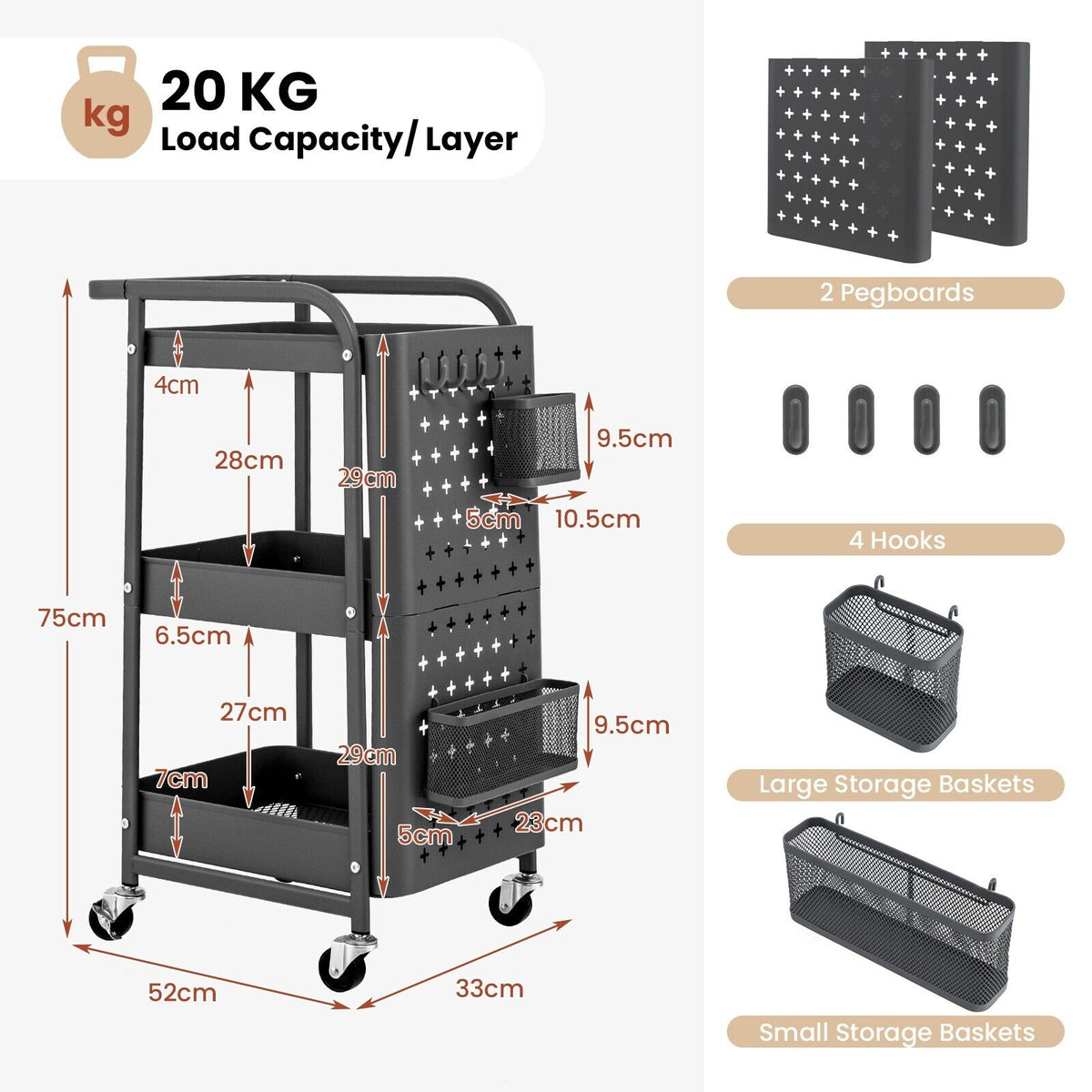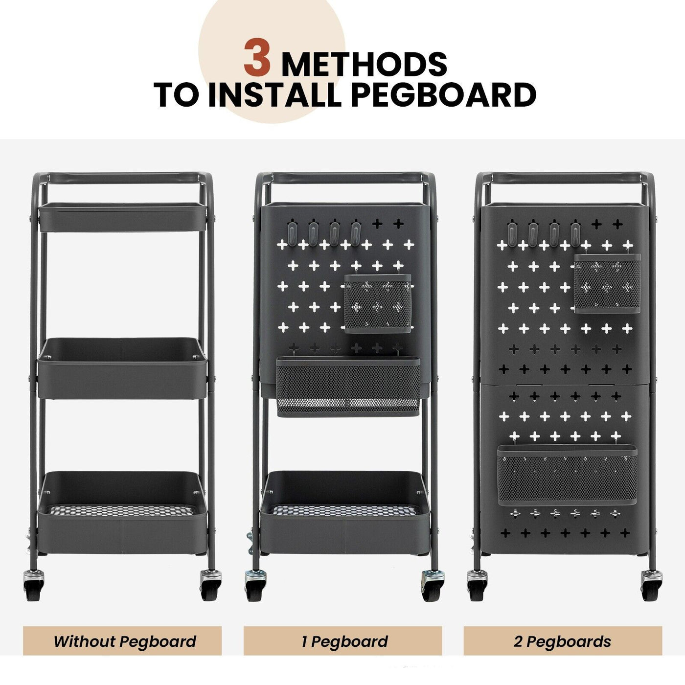3-Tier Rolling Storage Organizer Cart with Dual DIY Pegboards-Gray