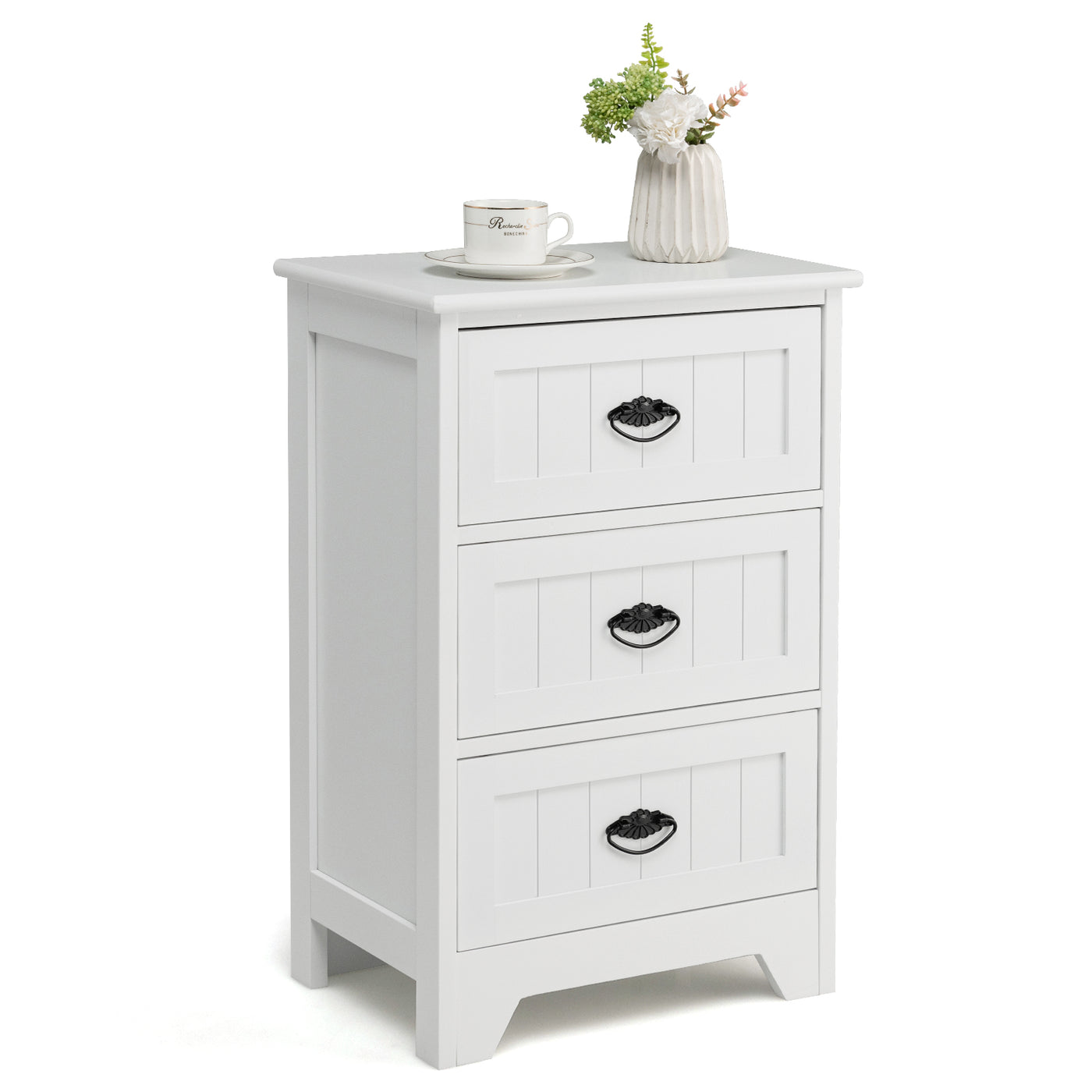 The bedside table with 3 drawers is a good addition to store bedtime essentials and your private items. Meanwhile, it has a spacious tabletop for vases, alarm clocks, chargers and more. Put the end table in your bedroom, living room or study, you can enjoy your leisure life with everything by you side. What's more, the sofa side table is not only functional, but also attractive to decorate your space. The exquisite handles highlight the design concept, catering you taste of vintage style. And the nightstand also has a sturdy construction, which is sure to serve you for long. The premium painted MDF material prolong the service life while ensuring hassle-free maintenance. Classified and Concealed Storage Space: The bedside table offers 3 pull-out drawers as a wise storage option to remote controls, chargers and other private items. The concealed space can well protect your privacy. On the other hand, you can put cups, glasses, bedtime readings on the tabletop for easy reach. Sturdy and Durable Construction: Made of premium MDF material, the wooden nightstand features a stable structure and a rather long service life. Its tabletop can support up to 40kg, while each drawer can hold 10kg. Besides, the backboard is fitted with anti-toppling belt, with which you can mount the nightstand to the wall for added safety. Vintage and Elegant Appearance: With sleek lines and classic color collocation, the sofa side table presents a touch of modern flair. What's more, the elegant and vintage metal handles not only make it easy to pull out the drawer, but also add a retro appeal to the unit and make it rather attractive. Versatile Cabinet for Wide Application: The end table has proper dimensions of 45 x 30 x 68cm (L x W x H), which fits the narrow spaces and is suitable for the bedroom, living room, study and more. With large storage capacity, you can use it as a nightstand, a sofa side table, 3-drawer cabinet or a chest of drawers. Hassle-free Assembly and Maintenance: The accent table comes with illustrated instruction is easy to assemble. What's more, there are labeled parts to help you recognize and put them together with ease. By the way, the smooth board surface with paint coating is waterproof, making daily cleaning a breeze.