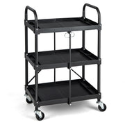 The rolling service cart features 3 spacious shelves, which not only can be used to store tools, but also can be used as a meal cart, or grocery cart, bringing great convenience to your work and life. Each shelf is designed with 4 small grooves, so you don't have to worry about missing small tools. And this folding cart is equipped with convenient handrails and 4 universal wheels (2 of them are lockable), allowing flexible and quiet movement anywhere. For your convenience, the cart is assembly-free. Besides, it is easy to fold, you just need to pull up the top pull ring to easily fold it up to store or carry. Sufficient Classified Storage Space: Designed with 3 spacious shelves, this tool cart can accommodate a variety of screwdrivers, pliers, drills, and other tools. There is a 31cm gap between each shelf, which is suitable for higher items like storage baskets. What's more, each layer has 4 small grooves to help you sort out small tools. Upgraded Heavy-Duty Structure: Crafted from a high strength metal frame, the folding tool trolley is not easy to crack, deform or peel. And the anti-rust finish makes it last for a long time. What's more, it comes with a support back bar to form a triangle structure to reinforce the structure for higher sturdiness. Effortlessly Mobile Your Tools: Equipped with 4 universal casters, the utility cart can easily carry your tools to wherever you need them. Moreover, 2 of them are lockable to help you safely park the cart in the proper place. And 2 built-in handrails enable you to push the cart without too much energy. Assembly-free and Folding Design: The tool cart is ready to use right out of the package, no assembly is required. And it can be folded to a compact size for convenient storage in a corner by simply pulling up the top pull ring. Weighing only 8kg, you can also take it with you on your travels. Multi-use in Various Occasions: With a practical and classic design, our folding 3-tier tool organizer can serve as a storage cart, grocery cart, tool cart, or service cart according to your needs. Moreover, it is portable for multiple occasions, such as a workshop, warehouse, office, laundry house, kitchen, etc.