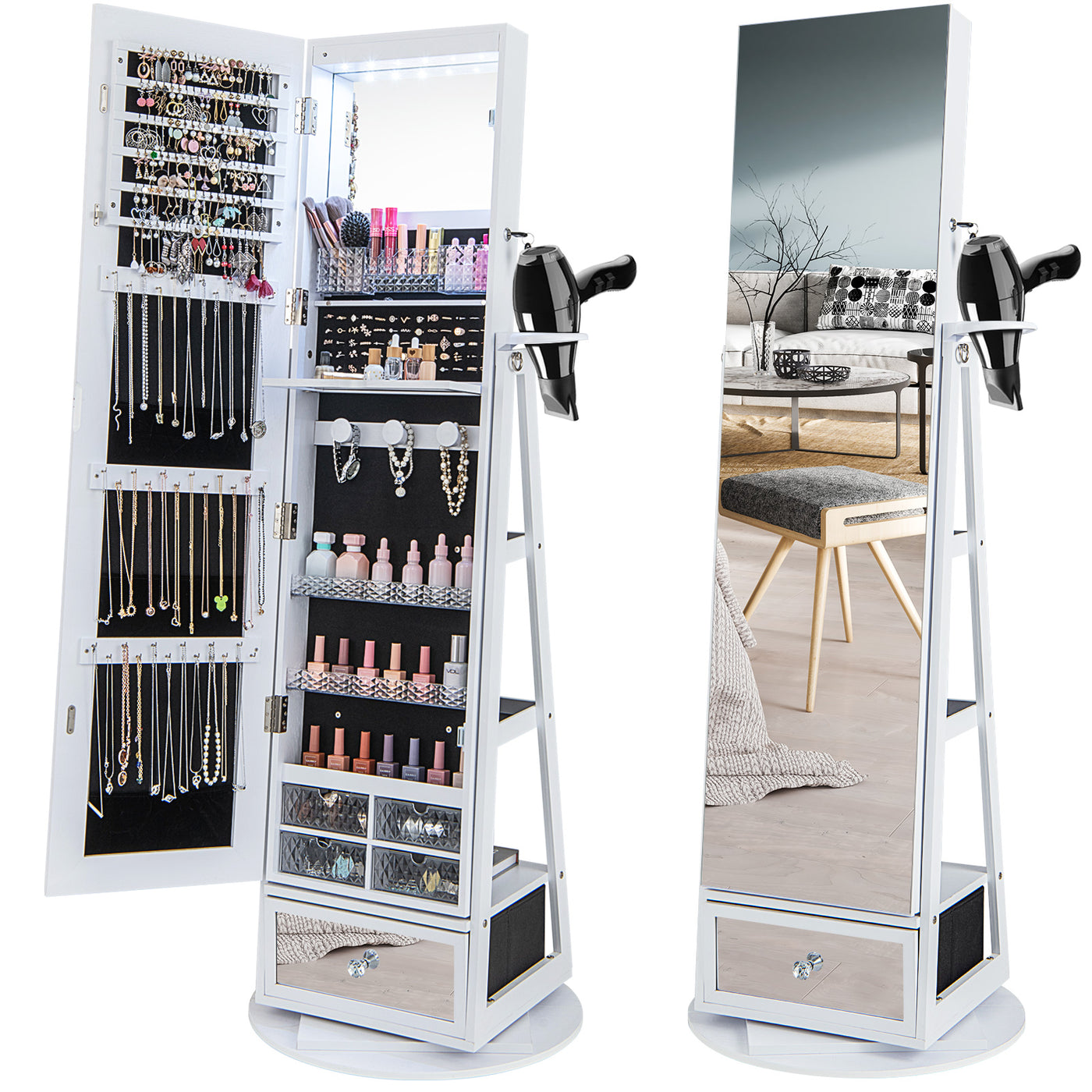 This incredible cabinet comes with a range of features that satisfy all your jewelry storage needs. There are 6 rows of earring racks, 3 rows of necklace hooks and 5 rows of ring slots with 1 foldable shelf. Additionally, you'll receive a hairdryer rack, an acrylic lipstick box, 3 bracelet rods, 2 detachable acrylic shelves, 4 acrylic drawers and 1 foldable non-woven fabric drawer at the bottom. As if that wasn't enough, there are 3 additional storage shelves at the back, providing more space for your accessories. The outside of the jewelry armoire boasts a full-length mirror, while the inside features a small vanity mirror. Besides, the built-in LED lights can create the perfect lighting for finding your favorite pieces. Perfect Jewelry Storage Solution: Equipped with 108 earring slots, 36 earring stud holes, 36 necklace hooks, 1 acrylic cosmetics and lipstick box, 65 ring slots, 3 bracelet rods, 2 removable acrylic storage shelves, 1 fixed storage shelf, 4 acrylic drawers, 1 large drawer, this jewelry armoire can keep all your treasures well organized. More Than a Jewelry Cabinet: The floor standing jewelry cabinet features a 140 cm x 37 cm full length and full screen mirror to provide you with a wide field of view from head to toe. What's more, with 3 additional shelves backside, the jewelry armoire can also serve as a storage rack or display stand. Built-in Mirror and LED Lights: There is a small vanity mirror inside of the jewelry cabinet. Along with the bright LED lighting, it is convenient for you to make up. The lights are powered by 3 x AAA batteries (not included). Besides, the foldable acrylic makeup shelf can be flipped down to place cosmetics during your makeup. Upgraded Convenience and Chic Design: This mirrored jewelry cabinet comes with a hair dryer rack, making it convenient to place and access the hairdryer when dressing up. The velvet necklace pockets prevent necklace scratches and tangles. In addition, the large foldable fabric drawer at the bottom with a front acrylic mirror panel design adds fashion. 360° Smooth Swivel and Safety Lock: Thanks to the flexible 360° rotating design, you can easily fetch items stored at the back of the jewelry cabinet. Plus, the jewelry armoire features a lockable door with keys to keep your belongings safe, while the magnetic catch design prevents the door from unwanted opening.