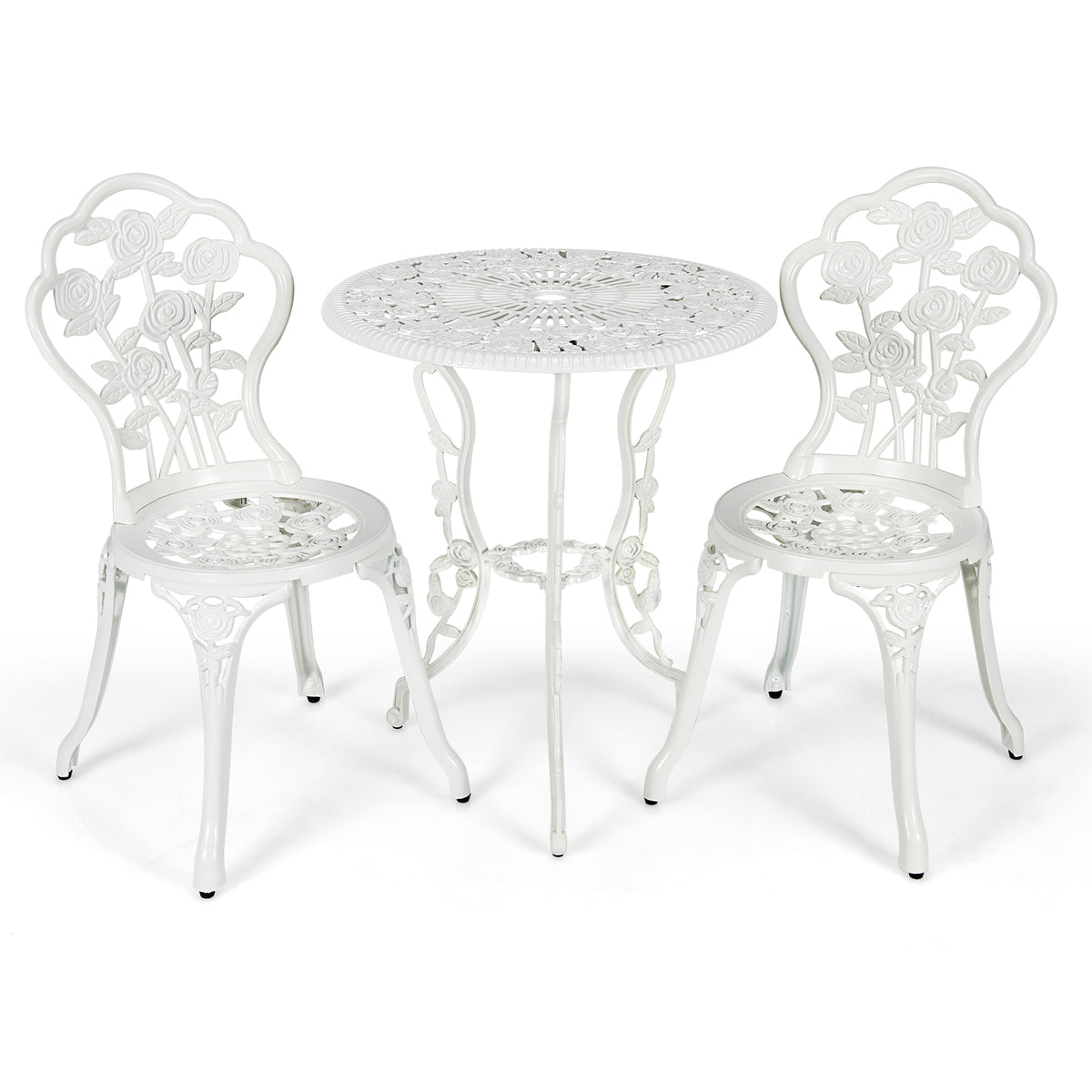 Enjoy outdoor leisure time with this beautiful yet practical 3pcs bistro table set. This bistro set is perfect for any small space or to accent a larger space. And it offers you a quiet, cosy space outdoors to host conversations, read a book, enjoy morning coffee or whatever else you like. Lightweight and constructed of rust-free cast aluminium and durable cast iron, which ensure it can last throughout the seasons. The highlight of this bistro table set is its antique exquisite appearance. This bistro set is the best decor for your garden and gives your guest a deep impression. It's also versatile, simply add some throw pillows to add colour and pattern, or you can mix and match this outdoor patio furniture with other pieces from the collection. Garden round top table equipped with an umbrella hole, this can be used with umbrella for sin-shade and rain-protection. Then you can enjoy your leisure time whether it's sunny and rainy. So, what are you waiting for? Do buy it now and it will never let you down. Durable cast aluminium structure which is rust free and weather-resistant Beautiful antique bistro table set which will be a great addition to garden and poolside. Cast aluminium frame with an environment-friendly coating which is anti-rust and offers worry-free use The unique, upscale design will compliment your garden, patio or backyard The bistro table set is the perfect way to greet your visitors as they enter your backyard The unique, upscale design will compliment your garden, patio or backyard Table with 45mm hole for an umbrella which can shade you when the rainy day Easy and quick to assemble with necessary hardware included
