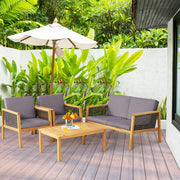 Various combinations for this outdoor sofa set allow you to rearrange based on the size of your space freely. Therefore, it is suitable for the courtyard and will fit for other outdoor places. Considering the changing weather, this patio furniture set is constructed of solid acacia wood and all-weather PE rattan. To extend the wooden furniture’s service time, please do not put it outdoors when it rains. What’s more, the loveseat and chairs are equipped with soft padded cushions and ergonomic armrests for a comfy sitting experience. And the large coffee table accommodates different items easily. If you are looking for an outdoor sofa set like this, do not hesitate to place an order! Delivery and Assembly: You will receive 2 packages in total. Please wait a few days if you only receive part of them. The detailed instructions and all necessary accessories (in box 1) are included in the package which helps you to assemble quickly. Please do not tighten all the screws until all the holes are aligned. Sturdy Construction: Constructed of high-quality acacia wood with reinforced crossbars and the weather-resistant mix brown PE rattan, this patio furniture set not only comes with strong loading capacity, but also maintains its long-lasting outdoor service time. Soft Padded Cushions: Each comfortable cushion is filled with high-density cotton that is soft to touch for better sitting experience. If you want to wash the covers, just remove them by unzipping. Please take cushions back home if it rains to make them accompany you for a longer time. Free Combination: According to your different preferences and available places, this 4-piece outdoor PE wicker furniture set provides multiple combinations for flexible layout. After choosing an appropriate layout, you can invite your friends and family to chat and eat together. Applicable Places: This outdoor conversation set features ergonomic armrests and cozy backrests that are comfortable for you to sit on. And the combination of a mix of brown PE wicker and natural wood grain makes this outdoor chat set look modern and rustic on the patio, garden, poolside or backyard.