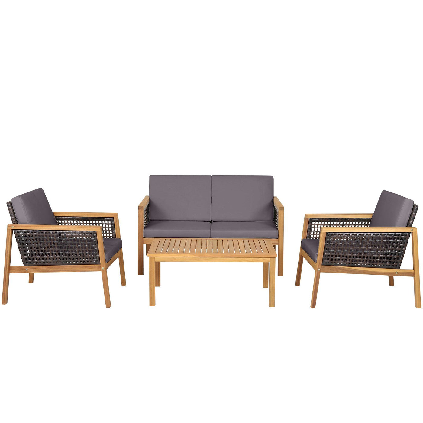 Colour of PE Rattan: Mix Brown Colour of Cushion: Off White/Grey Material: PE Rattan, Acacia Wood, Polyester, Cotton, Sponge Dimension of Table: 90 x 60 x 39 cm (L x W x H) Dimension of Each Chair: 65 x 77 x 74 cm (L x W x H) Dimension of Loveseat: 121 x 77 x 74 cm (L x W x H) Dimension of Each Seat Cushion: 56 x 56 x 8 cm (L x W x Thickness) Dimension of Each Back Cushion: 56 x 42 x 8 cm (L x W x Thickness) Seat Height: 31 cm Armrest Height: 57 cm Net Weight of Table: 7 kg Net Weight of Each Chair: 11 kg Net Weight of Loveseat: 16 kg Weight Capacity of Table: 75 kg Weight Capacity of Each Chair: 160 kg Weight Capacity of Loveseat: 320 kg Box Qty:2(May vary by batch)Package Includes: 1 x Table 1 x Loveseat 2 x Chairs: 4 x Seat Cushions 4 x Back Cushions 1 x Instruction Manual