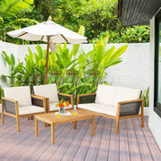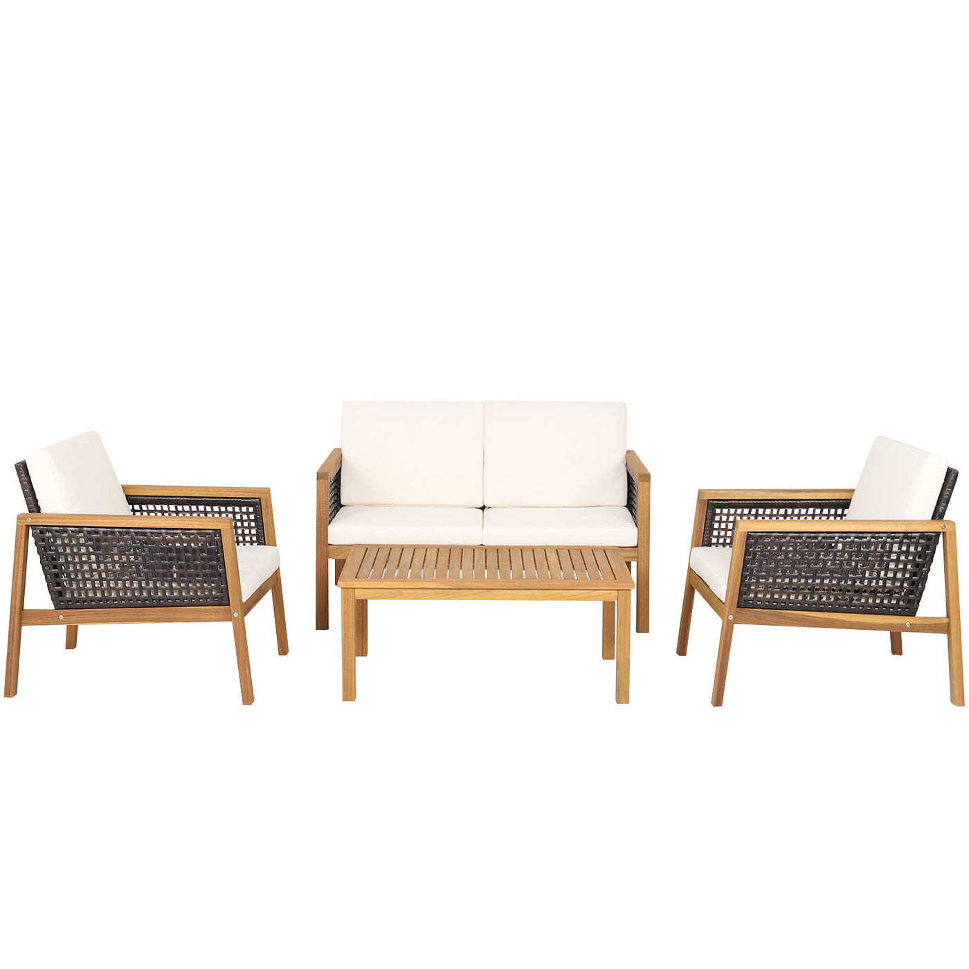 Various combinations for this outdoor sofa set allow you to rearrange based on the size of your space freely. Therefore, it is suitable for the courtyard and will fit for other outdoor places. Considering the changing weather, this patio furniture set is constructed of solid acacia wood and all-weather PE rattan. To extend the wooden furniture’s service time, please do not put it outdoors when it rains. What’s more, the loveseat and chairs are equipped with soft padded cushions and ergonomic armrests for a comfy sitting experience. And the large coffee table accommodates different items easily. If you are looking for an outdoor sofa set like this, do not hesitate to place an order! Delivery and Assembly: You will receive 2 packages in total. Please wait a few days if you only receive part of them. The detailed instructions and all necessary accessories (in box 1) are included in the package which helps you to assemble quickly. Please do not tighten all the screws until all the holes are aligned. Sturdy Construction: Constructed of high-quality acacia wood with reinforced crossbars and the weather-resistant mix brown PE rattan, this patio furniture set not only comes with strong loading capacity, but also maintains its long-lasting outdoor service time. Soft Padded Cushions: Each comfortable cushion is filled with high-density cotton that is soft to touch for better sitting experience. If you want to wash the covers, just remove them by unzipping. Please take cushions back home if it rains to make them accompany you for a longer time. Free Combination: According to your different preferences and available places, this 4-piece outdoor PE wicker furniture set provides multiple combinations for flexible layout. After choosing an appropriate layout, you can invite your friends and family to chat and eat together. Applicable Places: This outdoor conversation set features ergonomic armrests and cozy backrests that are comfortable for you to sit on. And the combination of a mix of brown PE wicker and natural wood grain makes this outdoor chat set look modern and rustic on the patio, garden, poolside or backyard.