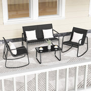 Color: Black Material: Metal, Fabric, Tempered Glass Dimension of Rocking Chair: 73 x 61 x 80 cm (L x W x H) Dimension of Loveseat: 73 x 114 x 80 cm (L x W x H) Dimension of Coffee Table: 75 x 44 x 40 cm (L x W x H) Seat Height: 43 cm Seat Depth: 44 cm Weight Capacity of Each Rocking Chair: 150 kg Weight Capacity of Loveseat: 300 kg Weight Capacity of Coffee Table: 30 kg Total Net Weight: 24 kg >Box Qty:1(May vary by batch)Package Includes: 2 x Rocking Chairs 1 x Loveseat 1 x Coffee Table 1 x Instruction Manual
