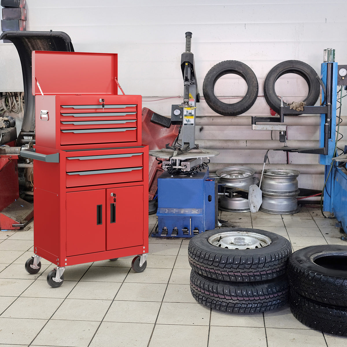 6-Drawer Rolling Tool Chest with Universal Wheels and Hooks-Red-S