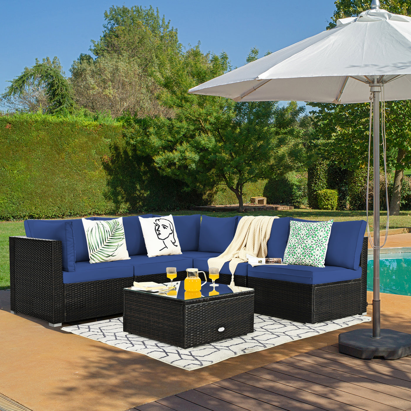 The wide seat with cozy seat and back cushions makes it comfortable to relax. Each cushion is designed with zipper for easy maintenance. Moreover, the coffee table is perfect for place drinks and snacks, making them easy to fetch. Both the sofas and coffee table are super sturdy with a solid metal frame and L-shaped aluminum feet. Also, the well-coated surface makes the frame not easy to rust, ensuring long service life. The well-woven rattan adds both beauty and durability to the whole set. Last but not least, the 6 pieces can be combined freely to satisfy more of your demands. If you are looking for a 6-piece patio sofa set like this, do not hesitate to place an order! Delivered in 3 Packages: This 6-piece patio set will be delivered in 3 boxes so the arrival time may be different. The screw bag for the whole set is in box 1. And all the 6 pieces are simple to assemble with clear instructions. Please do not tighten all the screws until all the holes are aligned to facilitate the installation. Cozy Sitting Experience: Each sofa is equipped with seat and back cushions for higher comfort level. Filled with high-density and elastic sponge, the cushions effectively make the seat much softer and cozier to sit. In addition, smooth zippers are designed for easy removal and maintenance of cushion covers. Note: Please always keep cushions dry to prolong the service time. Due to the light avoidance and light exposure, the color of the cushions is slightly different. Top-Quality Material: Featuring reinforced and rustproof metal frame, the sofas and coffee table are of super high stability. Each sofa can load 180kg and the coffee table can load 45kg. Apart from that, the elegant PE rattan is also durable for long-time outdoor use. Tempered Glass Coffee Table: The square coffee table provides you with sufficient space for snacks and drinks, so that you can fetch them without effort. And the tabletop is made of high-grade tempered glass, which is super easy to maintain. Multiple Combining Methods: This 6-piece patio wicker sofa set includes 1 coffee table, 2 corner sofas and 3 armless sofas. All 6 pieces can be freely combined to fit different sizes of places. With appealing appearance and high functionality, this patio sofa set is ideal for backyard, poolside, deck and so on.