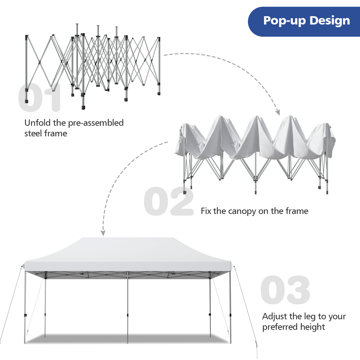 Perfect outdoor shelter canopy! Are you looking for an garden gazebo that is easy to carry and store outdoors? This folding tent offers 3m x 6m of shade and is ideal for outdoor picnics, parties, or business events. The party tent is made of 300D silver-coated oxford fabric, which provides sun protection and water resistance. And the powder coated steel frame is strong and resistant to rust. In addition, we provide ropes and stakes to fix the canopy to the ground for improved stability. In addition, this functional tent comes with a portable wheeled storage bag, making the camping gazebo easier for you to take the waterproof gazebo to the beach, markets, parks and other places. 3 Height Positions and Sturdy Frame: The pop up canopy has easy-to-operate height adjustment buttons on each legs. The gazebo height can be adjusted to 310cm, 320cm and 330cm according to different needs. The canopy is composed of powder-coated steel frame, which is stable and rust resistance. Weather-resistant Material: The pop up gazebo adopts high-quality silver coated 300D oxford cloth, which is tear resistant and can effectively block the hot sun. Thus,this folding canopy tent can provide reliable shelter for you sunny days. Large Shelter for Multiple Activities: This folding canopy has provided 3m x 6m spacious space, which can accommodate about 20 people. You can place dining tables, lounge chairs to hold various outdoor activities, such as party, picnic, wedding. It is ideal for beach, park, yard, etc. Portable Wheeled Storage Bag: The 300D black PE coated wheeled storage bag is easy to carry, move and stand on. The bag measures 165 x 40 x 24cm, which is compact enough to fit in most car trunks. You can take marquee canopy to the beach, park or wherever you want easily! Besides, the carrying bag has a small pockets to store windproof rope and nails. Easy Set up Folding Design: Equipped with a clear instruction, this instant canopy tent can be easily set up in a short time without additional tools. All you need to do is unfold the steel frame, secure the canopy cover with hooks and buckles, adjust outdoor gazebo to the right height, and install the windproof rope and ground nails.