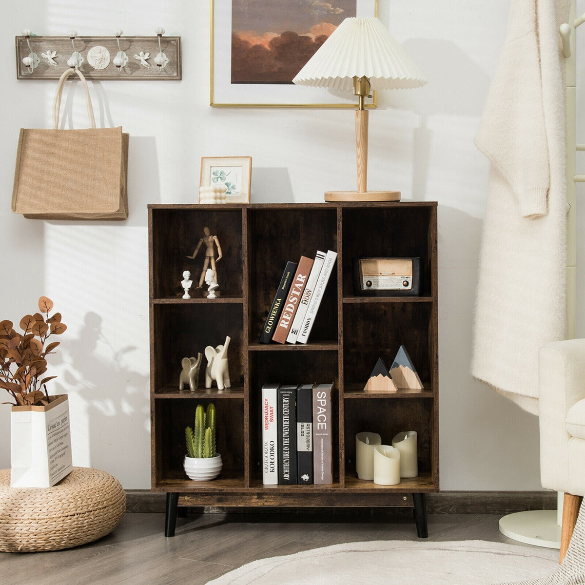 The cubic storage cabinet meets your expectations in functionality and aesthetics! Except for being placed at home, this cabinet is also perfect for the office with its simple and stylish look. This storage shelf holds your items safely and stably with a total loading capacity of 60 kg. If you are looking for a storage bookcase like this, do not hesitate to place an order! 8-Cube Storage Organiser: From clearing up clutter to neatly storing things, this 8-cube storage bookcase offers ample space to orderly store things in partitions, which is a versatile accent that works in nearly any room. And the spacious cabinet top can be fully utilized to display treasures, plants, etc. Wide Application: This freestanding shelf works well as a storage bookcase, a side cabinet, a kitchen rack or a display shelf. Helping you to create a clutter-free place in no time, while leaving enough living space. In addition, the open cubes are specially designed for easy access. Selected Material and Stable Construction: Made of a premium engineered wood frame and solid rubber wood legs, this display bookshelf ensures high stability and lasting durability. And bottom non-slip foot pads protect the floor from scratches. Also, a back anti-tipping device can avoid accidental toppling over for good safety. Chic Style and Elegant Appearance: This open cube bookcase features a unique cross-partition design and industrial/ modern style, delivering aesthetic visual effects and adding a sense of refreshing to your home. This cabinet is suitable for a variety of occasions, like living room, bedroom, study, hallway, etc. Easy to Assemble and Clean: In order to shorten the installation time, we will provide a detailed user guide and accessories. You can assemble this storage cupboard step by step. In addition, the smooth and waterproof surface is easy to clean and maintain with a wet towel.