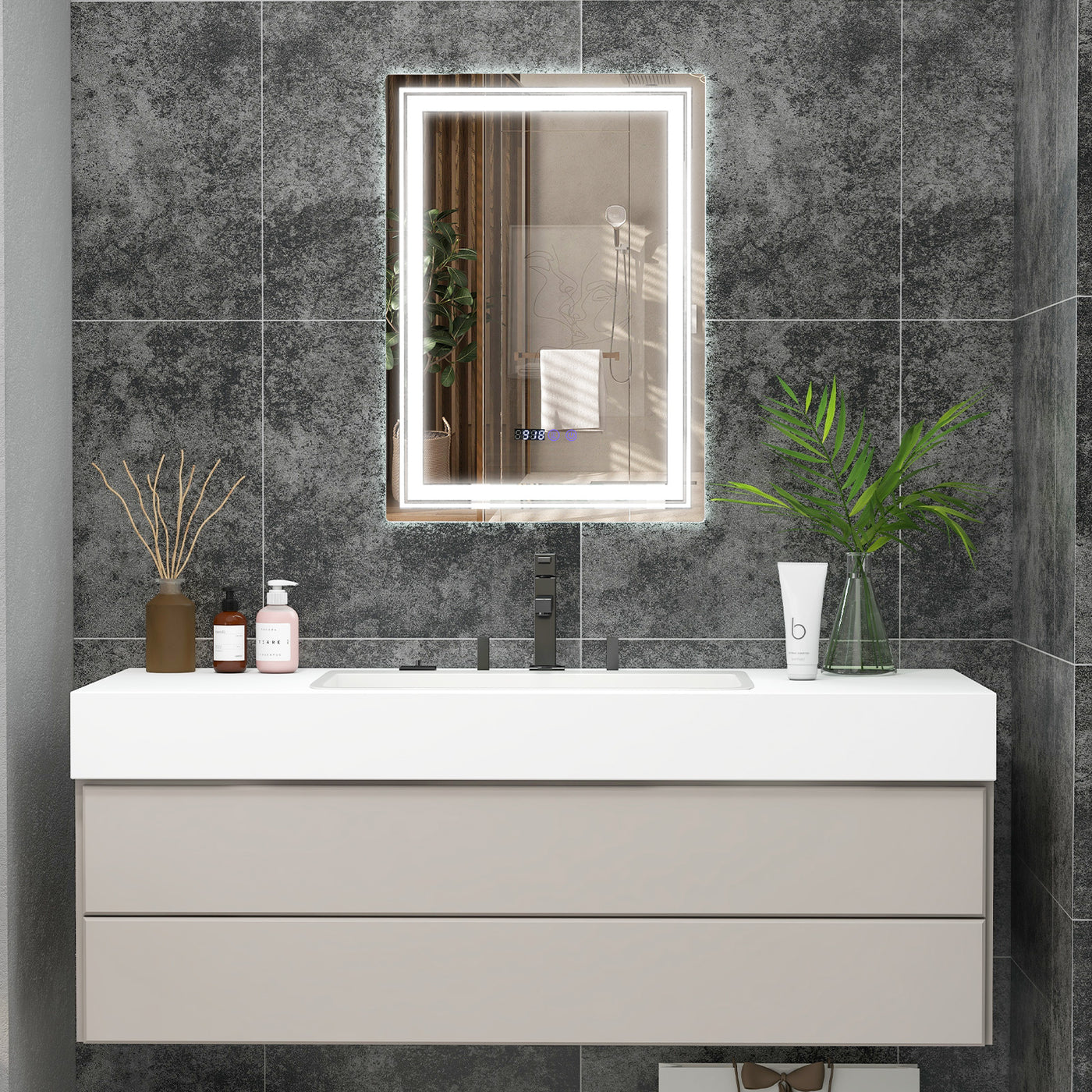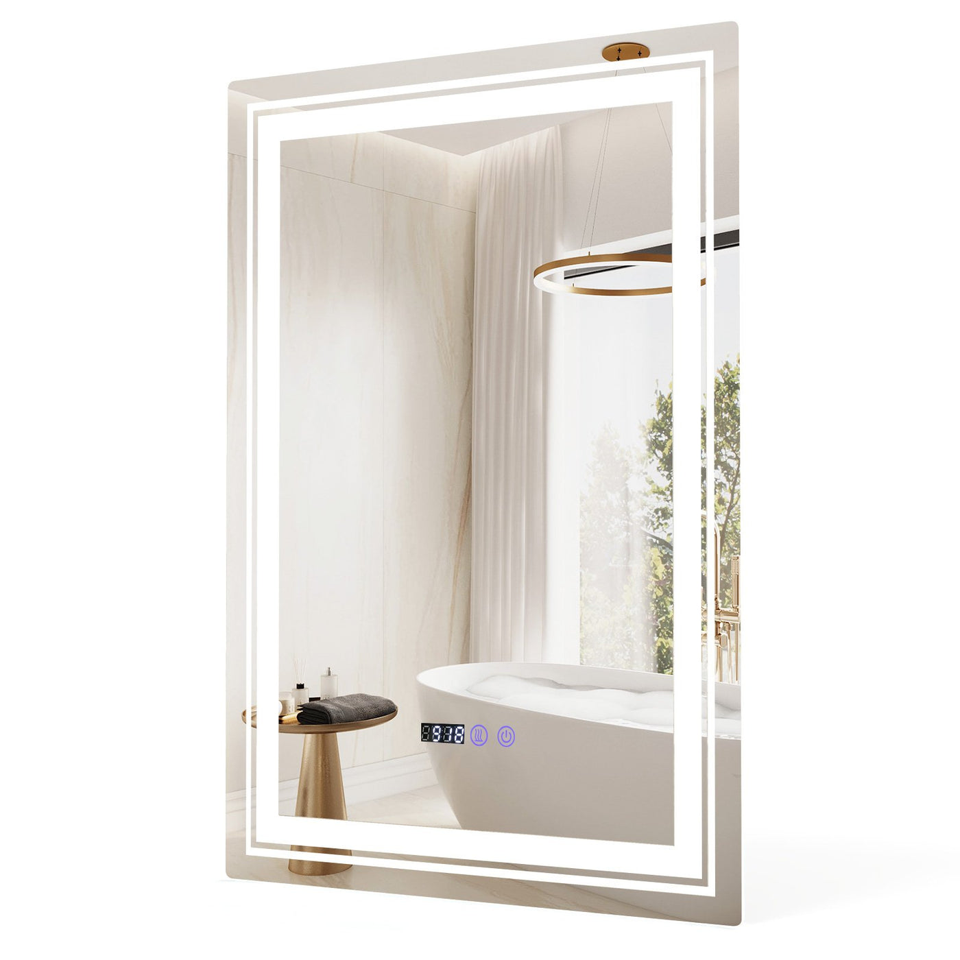 This mirror offers three color light options to suit your needs, including 3000K warm light, 4500K natural light, and 6500K white light. Not only does this mirror offer versatile lighting options, but it also features dimmable brightness. With an anti-fog function, this mirror provides a crystal-clear reflection. Crafted with copper-free silver tempered glass, this LED vanity mirror is designed for durability. Designed for flexibility and convenience, this bathroom LED vanity mirror can be used with a plug or a wall switch. Upgrade your bathroom or dressing area with the vanity wall mirror. Experience versatile lighting options, anti-fog functionality, and a durable design. Illuminate your space exactly how you want it! If you are looking for a vanity wall mirror like this, do not hesitate to place an order! 3 Color Lights and Dimmable Brightness: Experience versatile lighting options to choose from 3000K warm light, 4500K natural light, or 6500K white light to suit your needs. Plus, you can easily adjust the color temperature with a short press and dim the brightness from 20% to 100% with a long press. Memory function brings convenience for you. Anti-Fog Function: Say goodbye to foggy mirrors with the defogging bathroom mirror. The innovative anti-fog function ensures a crystal-clear reflection, even in steamy bathroom conditions, and can achieve one hour auto off. No more waiting for the mirror to clear up before getting ready. Copper Free Silver Tempered Glass: The LED vanity mirror is crafted with a 4-layer design for great quality including a 5mm hd float mirror, a specular layer, a special environmental protective layer, and an explosion-proof membrane. It not only provides a clear and precise reflection but also resists corrosion and ensures durability to last for years to come. Touch Screen for Easy Operation: This wall-mounted makeup mirror can simplify your daily routine with the touch screen operation. Adjust the settings, including time display and temperature display with just a tap of your finger. Enjoy effortless control and press the defog button for about 3 seconds to adjust the time. Fit for Plug or Wall Switch: The bathroom led vanity mirror is designed to be flexible and convenient. Whether you prefer using a plug or a wall switch, the mirror can be easily accommodated. Simply cut off the plug if you're connecting it to a wall switch. Plus, the 155cm power cord length is for easy installation.