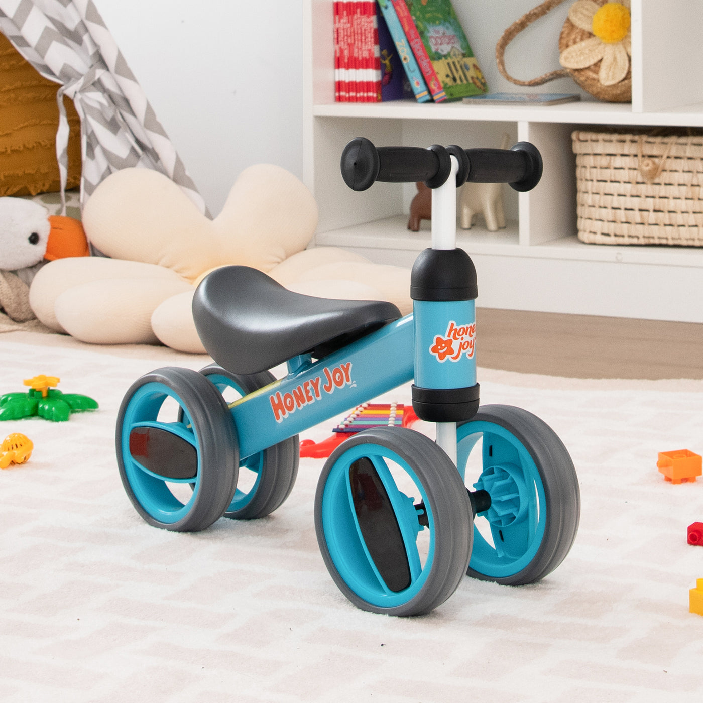 This cute balance bike will be a great gift for toddlers from 1-2 years old. This baby balance bike is built with 4 wheels and sturdy steel frame, which ensures stable riding and high weight capacity. And the wheels are made of PP and EVA materials, which makes the wheels wear resistant and noiseless for indoor and outdoor use. Considering safety, the bike is designed with 135° limited steering to protect the bike from rolling over, particularly in turning. Also, the handle is equipped with non-slip textures and the soft seat is comfortable for long time sitting. With instructions and accessories, the assembly is easy and quick. 135° Limited Steering: The 135° limit steering design helps to avoid side falling down when taking a sharp turn, thus proving your kids a safe riding experience. Besides, this no-pedal baby bike has a non-slip and comfortable TPR handle, which can help your children control the direction better. Widened Silent Wheels: Made of wear-resistant and anti-slip PP and EVA material, the 4 heavy duty widened wheels ensure a smooth and secure riding experience. Moreover, the wheels are noiseless and have no damage to the floor, making the infant bike suitable for lawns, carpets, asphalt roads, hard floors, etc. Comfortable Seat and Stable Structure: The high-density sponge padded seat cushion with smooth leather surface provides a cozy sitting position for your baby. Because of the sturdy steel tube frame, this ride-on bike has excellent stability and load bearing capacity. Perfect First Bike for Baby: This 4-wheel balance bicycle is suitable for 1-2 year old babies with a height range of 50-100cm. It’s an ideal first bike gift for toddlers who are learning to walk or develop balance and they will have a lot of fun and build confidence when using their legs to go forward or back forward. Lightweight Design and Easy Assembly: This toddler walking training bike is light enough that your children are able to carry around without adult’s help. In addition, with detailed instruction and complete accessories, you are allowed to put together in a short time.