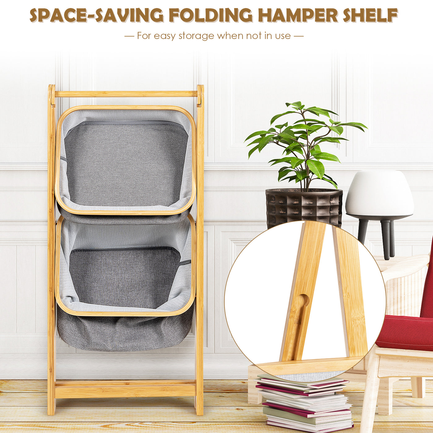 Bring you great convenience with our bamboo laundry hamper! Made of high-quality bamboo with stable A-shaped structure, this folding laundry hamper ensures long service time. The large storage shelf and two roomy baskets with open design allow you to place a variety of items while making the access more convenient. Thanks to the portable handle, this lightweight laundry sorter can be transported to any place. With elegant appearance and space-saving folding design, this bamboo laundry basket can be easily stored and is suitable to be used in your bathroom, bedroom, laundry room, living room or entryway. Foldable and Space-Saving Design: This freestanding laundry basket rack measures compact size, which adds extra storage space while saving floor space. And the A-frame and cloth baskets can be easily folded when not in use, so that you can tuck it into any corner or beneath the furniture. Ample Storage Space: This laundry hamper comes with 2 large storage baskets, which can offer you sufficient storage space store your sundries in a sorted way, like clothes, laundry detergent, shampoos, toys, books and more. Besides, the top handy handle can be used to hang towels. A-Shaped Bamboo Frame: Made of natural and superior bamboo material, this laundry storage hamper exhibits strong durability and is not easy to deform or crack. In addition, the special A-shaped frame forms stable triangular construction, adding extra steadiness for daily use. Excellent Workmanship and Durable Material: The surface and corners of the frame are smoothly polished and rounded off in case of accidental injuries due to any burrs and sharp edges. Besides, the dirty clothes baskets are covered with premium linen type cloth, which is durable and not likely to deform after long time use. Wide Application: This laundry organizer unit is lightweight, and you can easily move it anywhere with the built-in handle. With natural charm and practical design, this folding laundry sorter can be used as a storage rack for magazines, toys, blankets, towels and clothes in bedroom, living room, bathroom, laundry room, etc.