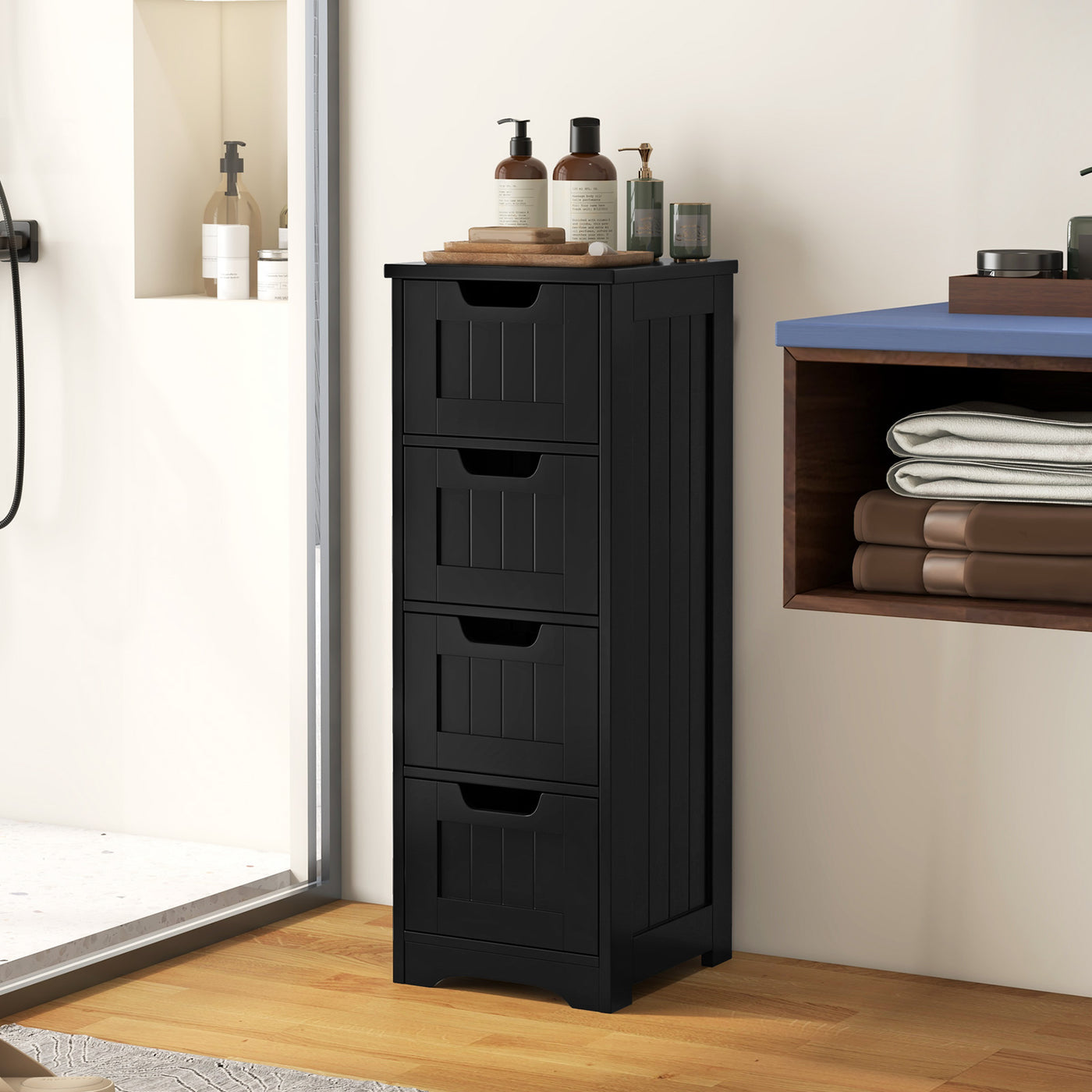 This bathroom floor storage cabinet with 4 drawers is ideal for your bedroom, bathroom, living room, office and more. The tabletop can hold your books, lamps and so on, and 4 deep drawers provide ample storage space for your hygiene items, toiletries, medications and other household accessories, which make your home more neat and tidy. Besides, high quality MDF material ensures long time service. The storage cabinet can hold a maximum load capacity of up to 50 kg, and each drawer can hold up to 5 kg. Moreover, the back of this cabinet is equipped with anti-toppling devices to fix to the wall for safe use. This versatile floor cabinet is great for any home style and helps to keep your home perfectly organized. Ample Storage Space: Featuring 4 large drawers, this freestanding storage cabinet provides ample space for books, clothes, towels and other daily supplies, which are suitable for your private items. Each drawer measures 25 x 26 x 18 cm(L x W x H). And the tabletop can accommodate lamps, photo frames, snacks and more. Cutout Handle Smooth Rails: Each drawer is designed with a cutout handle, so that you can open and close the drawer easily. In addition, the smooth slides allow you to access the items in the inner position without effort, and the stopper can protect drawers from accidental falling. Premium Material Sturdy Frame: This bathroom cabinet is constructed by premium MDF, which features great sturdiness and durability to support a long service life. Besides, there is an anti-toppling device on the back of the cabinet, which not only improves overall stability, but also protects your family from accidental injury. More, the tabletop can support up to 50 kg, and each drawer can hold up to 5 kg. Versatile Floor Cabinet: With clean lines and classic style, this floor cabinet can match well with any furniture style and adds a sense of elegance to your home. Overall dimension: 30 x 30 x 83.5 cm (L x W x H), the compact size allows you to use it as a bathroom cabinet or side table in your study room, living room, bedroom, bathroom and so on. Easy to Assemble Maintain: Comes with detailed instruction and necessary hardware, this bathroom floor storage cabinet can be assembled in a short time to save your time and energy. Besides, the smooth surface is waterproof, making it easy to clean with damp cloth.