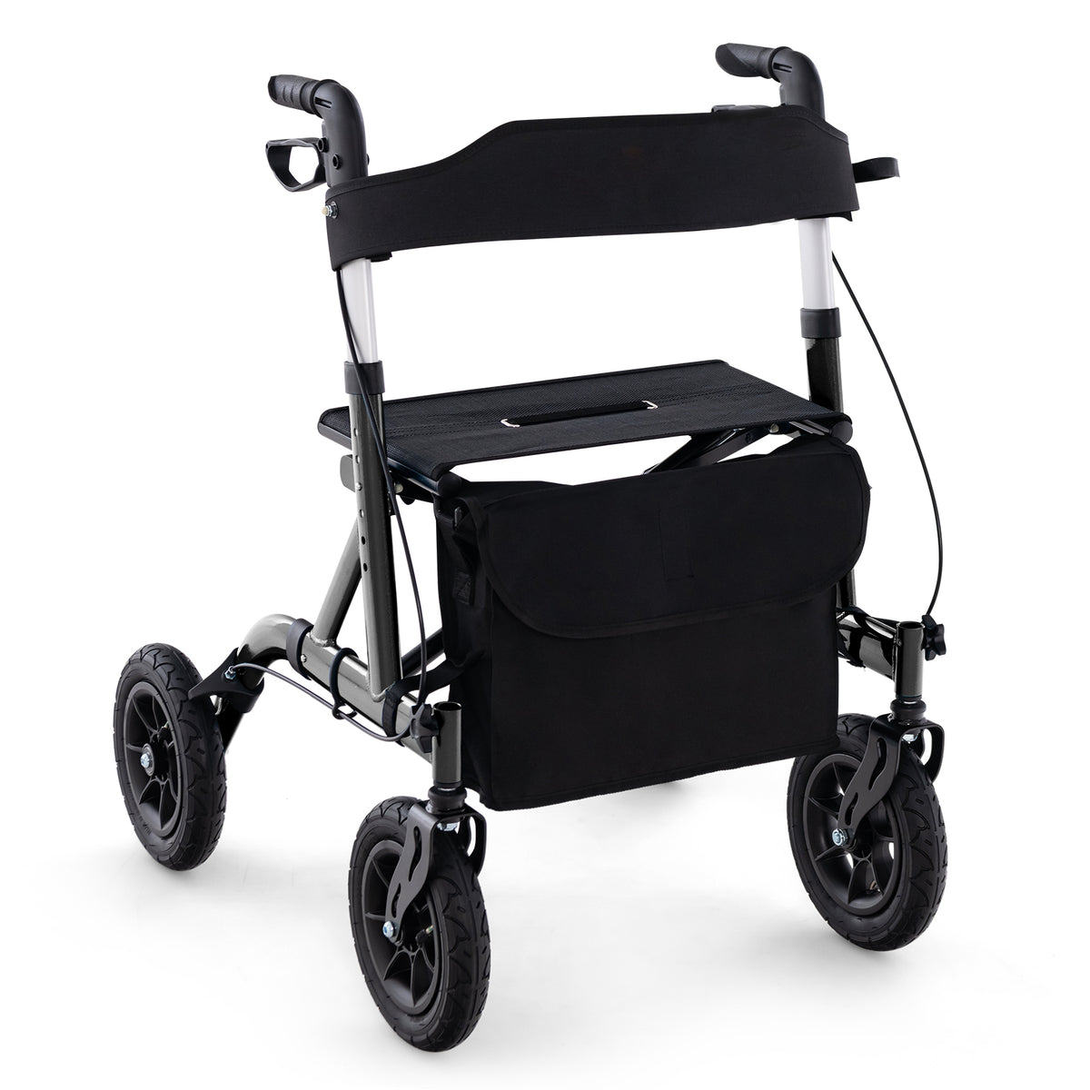 Experience ultimate convenience with our innovative convertible assistive walker. Equipped with 24cm all-terrain pneumatic wheels, our rollator walker provides high shock absorption, slip resistance, and low noise for a smooth move on various surfaces. Meanwhile, this rollator can effortlessly switch between walker and chair, allowing users to sit and relax whenever they want. Furthermore, the padded seat, supportive backrest, and relaxing handrails make it ideal for elderly users. With its convenient folding structure, this rollator can be easily stored and transported. Additionally,built with a durable aluminum structure, it features non-slip handles and 2 hand brakes, ensuring safety and reliability for the elderly. Perfect Outdoor Walker: This premium rolling walker is designed to support your indoor and outdoor daily routine without obstruction. Featuring two 24 cm all terrain pneumatic wheels, this walker provides better shock absorption function, slip resistance and low noise for a smooth and comfortable walking experience. Furthermore, these multi-terrain wheels rolls smoothly on various surfaces such as asphalt road, cement roadway, wooden floor, and brick road. Convenient Resting Companion: Weighing just 8.5 kg and measuring a compact 76 x 25 x 81 cm (L x W x H) after folding, this stand up rollator can provides effortless portability for outdoor use. Additionally, equipped with large seat, backrest and armrest, our walker offers a comfortable oasis for quick breaks during your activity. Notice: Please lock the brakes when seated. Customizable for Your Rollator: The 6-level adjustable rollator walker’s handle is is easy to adjust so you can find the perfect height between 81 cm to 93 cm to suit your needs. In addition, the walker comes with a convenient storage bag and umbrella holder, which can easily store various items and have a designated place to keep your umbrella handy, ensuring convenience and practicality on the go. Durable and Safe Construction: This rollator includes an stable aluminum structure for durability and long-lasting service life. In addition, it provides sturdy support with a maximum load capacity of 160 kg. Moreover, this rollator also features non-slip handles and 2 hand brakes to ensure your safety and stability. Comfortable Experience: To ensure that every step you take is accompanied by a luxurious sense of ease and relaxation, we have meticulously designed a padded seat, a supportive backrest and relaxing handrails to provide an unparalleled level of comfort, making it the ultimate companion for all your mobility needs.