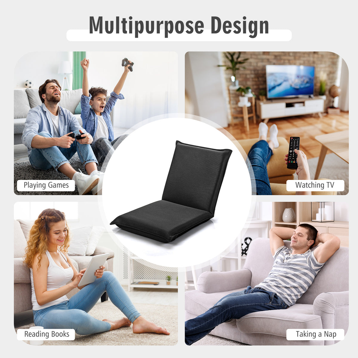 Are you looking for a floor chair with a reclining function? Then the floor chair is a good choice!The backrest can be adjusted in 6 different positions (including completely flat). So you will always find the most comfortable position. The backrest and seat cushion are filled with foam, which is comfortable and soft. You can put the floor chair in the living room, on the balcony or in the bedroom to watch TV, play and even sleep on it. This floor chair is also a great gift for family and friends. Good Material and Stable Structure: The floor chair is mainly made of high quality steel, foam, mesh, etc. The internal steel frame provides support and long service life. The fabric is wear-resistant and breathable. The floor chair can withstand a weight of 100 kg.Flexible Adjustable Backrest: The backrest can be adjusted to 6 levels (between 90 °and 180 °). So you will always find the ideal position for you. You can even lay the floor chair down flat completely and then stow it away to save space.Ergonomic Design and High Comfort: Without armrests, you can move freely on the floor chair. It is padded with foam and adapts to the curvature of the human body so that you do not feel tired even when you sit for long periods of time.Modern Design and High Practicality: The floor chair is available in a total of 6 colours (Black/Coffee/Grey/Navy/Khaki/Pink). The simple and modern design looks very pretty everywhere. The chair is suitable for living rooms, balconies, dormitories, etc. You can watch TV, play and sleep on it.Ideal Gift and No Assembly Required: The reclining chair is very suitable as a present for family, friends, colleagues, etc. It does not have to be assembled and is ready for immediate use. The cover can be easily removed and washed in the washing machine.