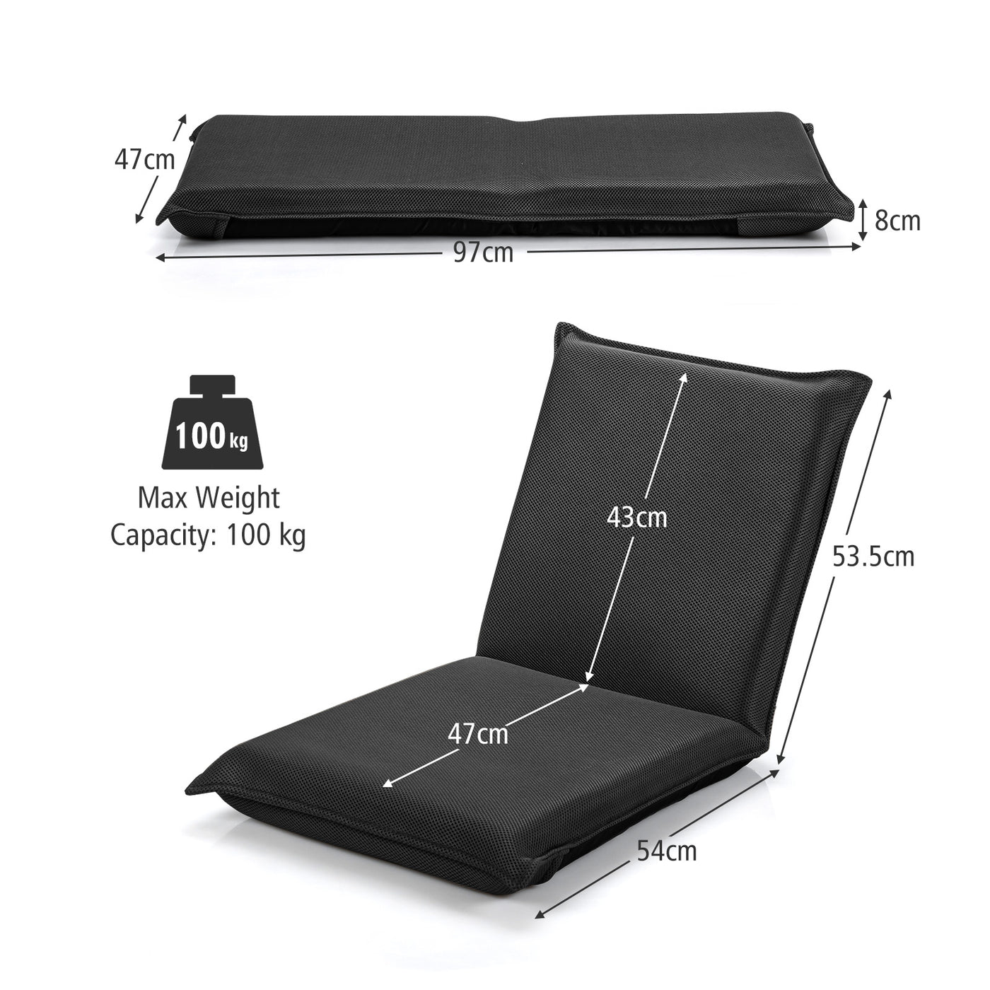 Box Qty:1(May vary by batch) Color: Black/Coffee/Grey/Navy Material: Steel, Sponge, Mesh Unfolded Dimensions: 98 x 45 x 8 cm (L x W x H) Upright Dimensions: 45 x 52 x 47 cm (L x W x H) Net Weight: 2.3 kg Weight Capacity: 100 kg Package Includes: 1 x Floor Chair 1 x Instruction Manual