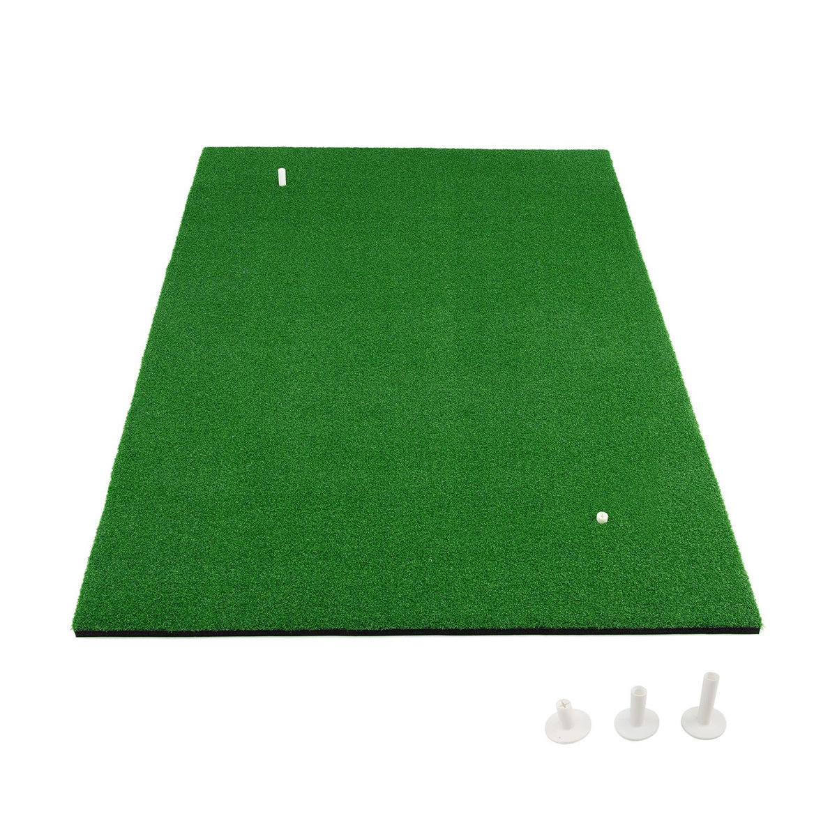 Enjoy your golf practicing with this golf hitting mat! Equipped with premium artificial turf, this golf hitting mat can stimulate the real feeling of playing at fairway, offering realistic practice experience at both indoor and outdoor places like patio, backyard and living room. Also, the thick and non-slip base is made of high resilient TPR material which can absorb the impact when the mat is hit. So your club' service life is ensured and your wrists are also protected. In addition, this golf putting mat not only features 2 tee positions, but also comes with 3 rubber tees for common practice. For convenient storage and transport, you can roll it up. If you are looking for a golf hitting mat like this, do not hesitate to place an order! Enjoy Real Feeling of Fairway at Anywhere: This golf hitting mat is equipped with synthetic turf with thickness up to 16 mm, which stimulate real grass turf. Thus, you are allowed to enjoy realistic and professional turf that offers you a real feeling of fairway at anywhere, such as backyard, patio, living room and more. Designed for Both Right and Left Handers: Featuring 2 tee positions on both side, this golf practice grass mat is suitable for all players including right handers and left handers. Also, the golf mat comes with 3 rubber tees with common driver tee heights of 4cm, 5.5 cm and 7 cm, and the 4cm rubber tee can be used to insert real golf tees. Reduce Impact on The Club and Wrist: The base of this golf hitting mat is made of 15 mm soft and high resilient TPR material. The thick base can effectively absorb the impact of the club when you hit the golf mat, which ensures long service life the club, and more importantly, protects your wrists. Durable Construction and Non-Slip Base: The upper synthetic turf and the lower TPR base are solid connected for highly tear-resistant and anti-impact, which makes this golf mat capable of long time using. With net weight of 11 lbs/5 kg, the weighted and non-slip base offers a good grip to the ground and avoids movement when practicing. Perfect Size and Easy to Transport: Measuring 1.5 m x 1 m, this golf hitting mat provides ample space for your hitting, driving and chipping. In addition, you can quickly roll it up for convenient and easy storage and transport. No matter using indoors or outdoors, this golf hitting mat will give you unmatched using experience.