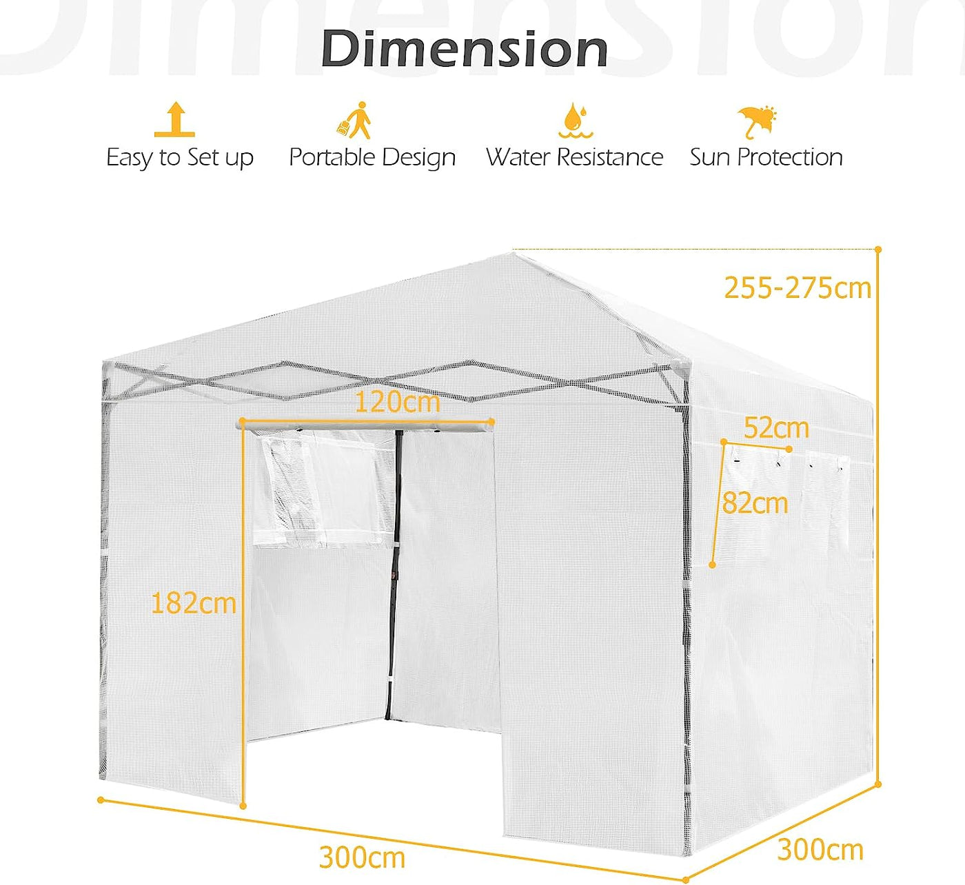Colour: White Material: Metal, PE Overall dimension: 300 x 300 x 255-275cm(L x W x H) Window dimension: 82 x 52cm (L x W) Window number: 4 Net weight: 19kg Box Qty:1(May vary by batch)Package includesÔºö 1 x PE cover 1 x Folding stand 10 x Ground stakes 4 x Anchors 4 x Ropes 1 x Instruction