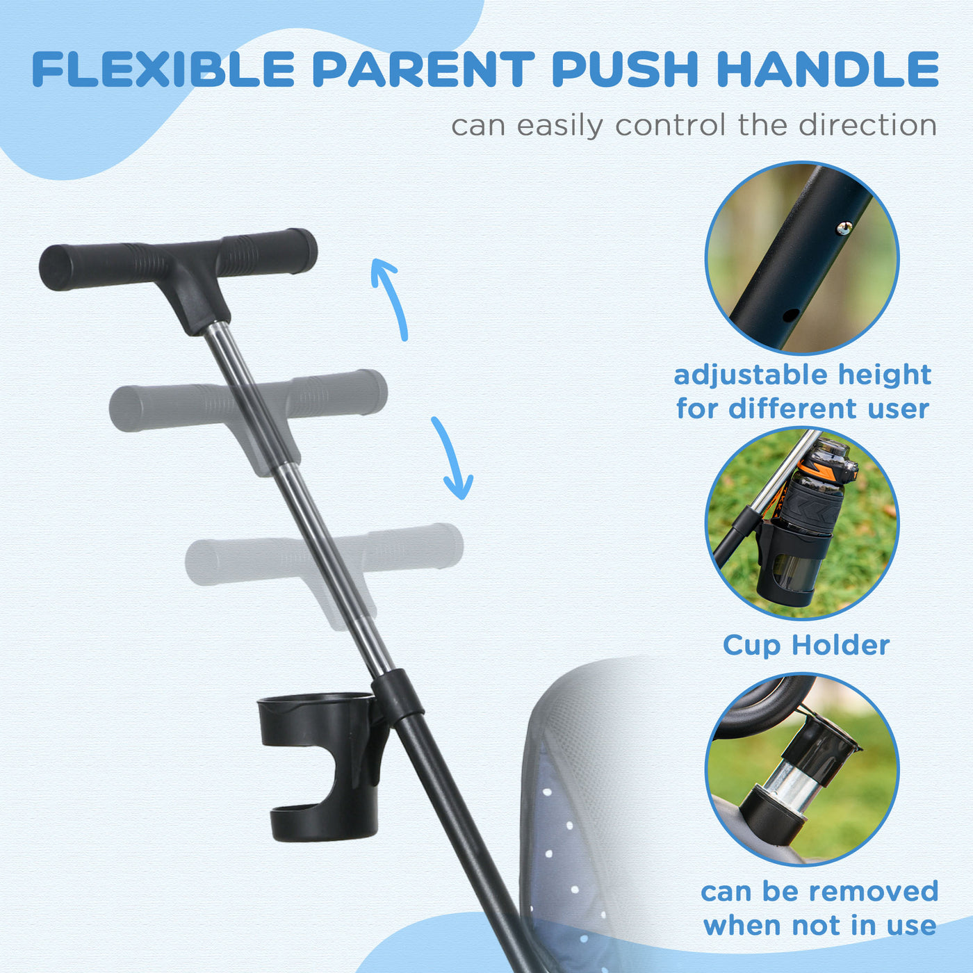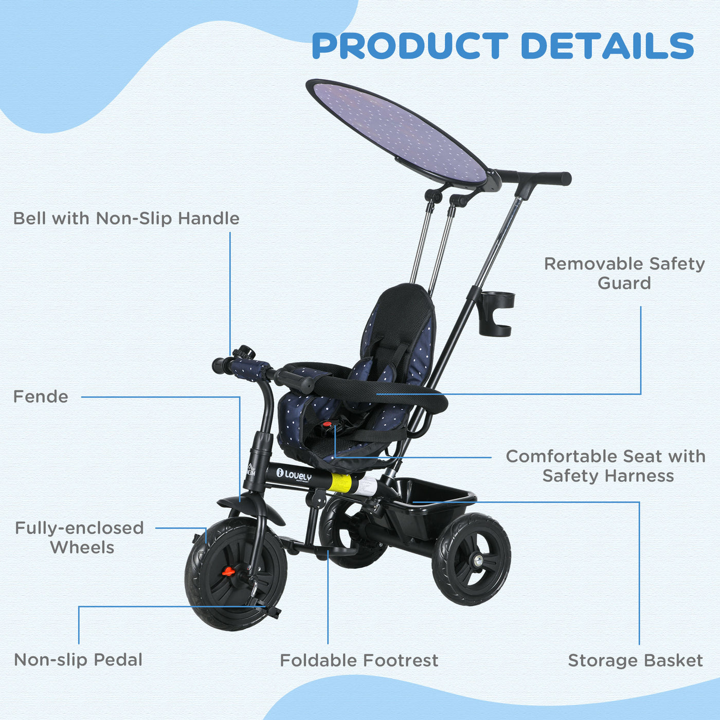 HOMCOM 6 in 1 Tricycle for Kids with 5-point harness straps, Removable Canopy, Dark Blue - Blue