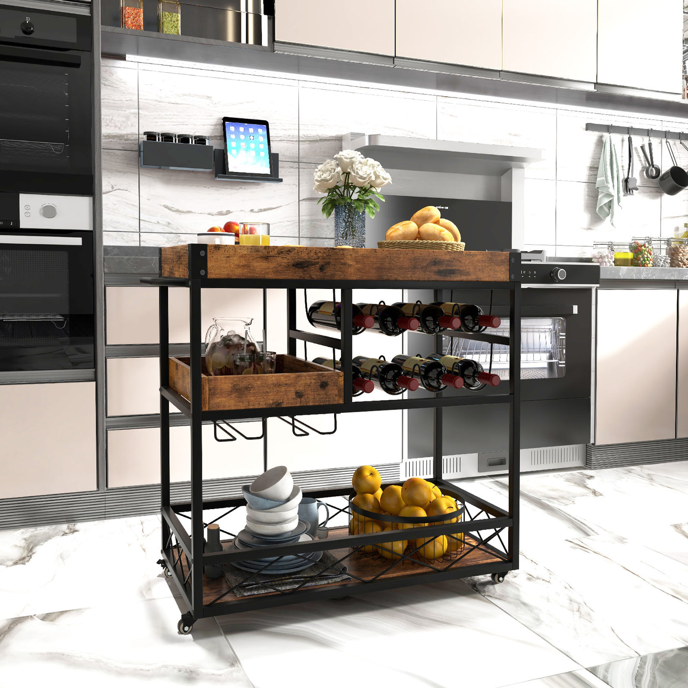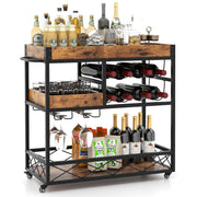 Enjoy quality life with this 3-tier rolling bar cart! The premium material and strong frame enable this home bar serving cart to withstand the test of time. With a removable top tray, you can find a different use of this bar cart. Besides, the 3-tier design provides you with abundant storage space for a variety of objects. Meanwhile, the raised baffles and fences avoid items from falling off. When you need to move this kitchen serving cart, the side handles and 360° swivel casters offer help. As a result, the home bar serving cart is accessible to you wherever you are. Furthermore, the retro and versatile outlook coordinates well with diverse home styles. Safe and Spacious Storage Space: This 3-tier rolling bar cart boasts a large storage capacity, storing and displaying many items like liquor, beverage, fruits and vegetables. The wine racks hold up to 8 wine bottles while the glass racks accommodate up to 12 goblets. Moreover, the protective fences prevent things from falling off. Convenient Handles and Casters: With 2 convenient handles and 4 rubber casters, you are able to push the home bar serving cart easily. The 4 universal casters, 2 of which have brakes, are smooth, silent and lockable for easy use. Thus, locked with brakes, the rolling kitchen cart can stand stably even on uneven ground. Durable and Sturdy Construction: The 3-tier home bar cart is made of high-quality material that promises a longer service time. More importantly, supported by the sturdy metal frame, this bar cart on wheels exerts great steadiness. Rustic Style and Wide Application: Featuring a rustic appearance, the bar cart with wine rack integrates well with a variety of scenarios, such as the kitchen, dining room, living room, bar, etc. Wherever it is, this rolling bar cart is a good assistant for you. Easy Installation and Maintenance: The home bar serving cart will come with concise and clear instructions for easy assembly. By the way, the removable tray renders cleaning easier and enhances versatility.