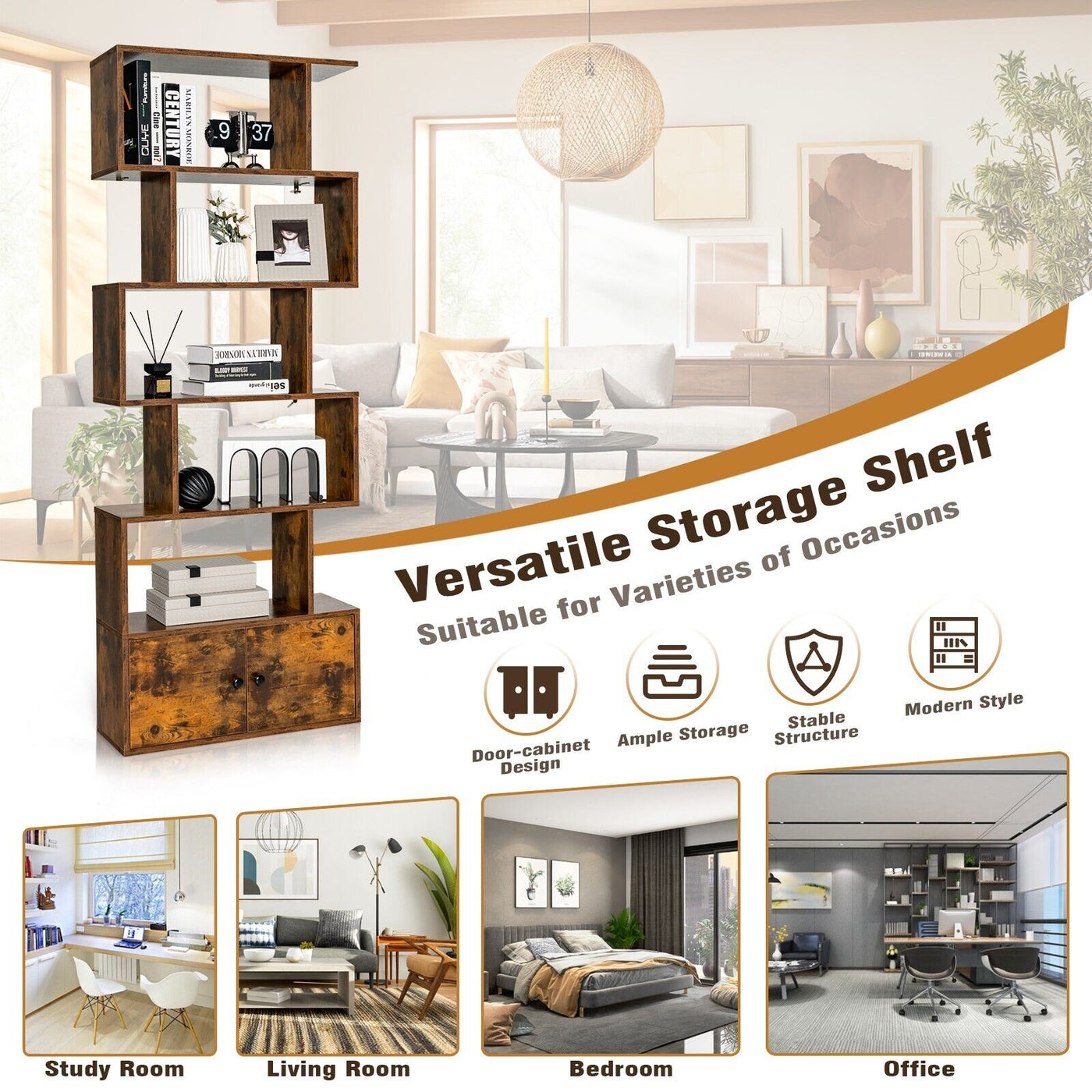 This 6-tier bookshelf features a large capacity to meet your daily needs of storing items. Great for placing and organizing your books, plants, collections and anything worth displaying your passion. A closed double-door cabinet on the bottom enhances the whole stability and enlarges your storage space. This freestanding S-Shaped shelving unit has a charming geometric look and is a perfect piece of furniture, ideal for your study room, bedroom, living room and home office, blending well with any home decor. 6-Tier Large Storage Space: This bookshelf features 6-tier design with 5 open shelves and 1 closed cabinet, providing ample storage space for organizing your books, plants, collections and anything worth displaying. Besides, the bottom cabinet with double doors provides a private enclosed space for your belongings while preventing dust accumulation. Durable and Stable Construction: Crafted by selected E0 grade engineered wood and premium MDF, this tall bookcase shelf boasts a solid structure, built to last for a long service time. Moreover, non-slip foot pads enhance the extra stability of the structure, and anti-tipping devices are provided to secure the shelf against the wall for higher safety. Versatile Storage Shelf for Wide Use: This freestanding storage shelf measures 72 inches tall, making the most of the vertical space of your room. You can use it as a bookshelf to arrange your books, as a display rack to show off your beloved collections, or as an office rack for efficient organization. It will be a perfect storage solution for the limited space. Unique S-Shaped Geometric Design: Designed with geometric S-shaped lines and an industrial vintage finish, this stylish bookcase is more decorative, perfectly blending with any style of furniture in your home, bringing more artistic styles to the space, perfect for various occasions, such as study room, living room, bedroom and home office. Easy Assembly and Maintenance: All necessary parts, tools and detailed graphic instructions are included for your easy assembly without spending too much time and effort. The smooth waterproof surface makes this bookshelf easy to clean and maintain. In addition, non-slip foot pads effectively protect your floors from scratches.