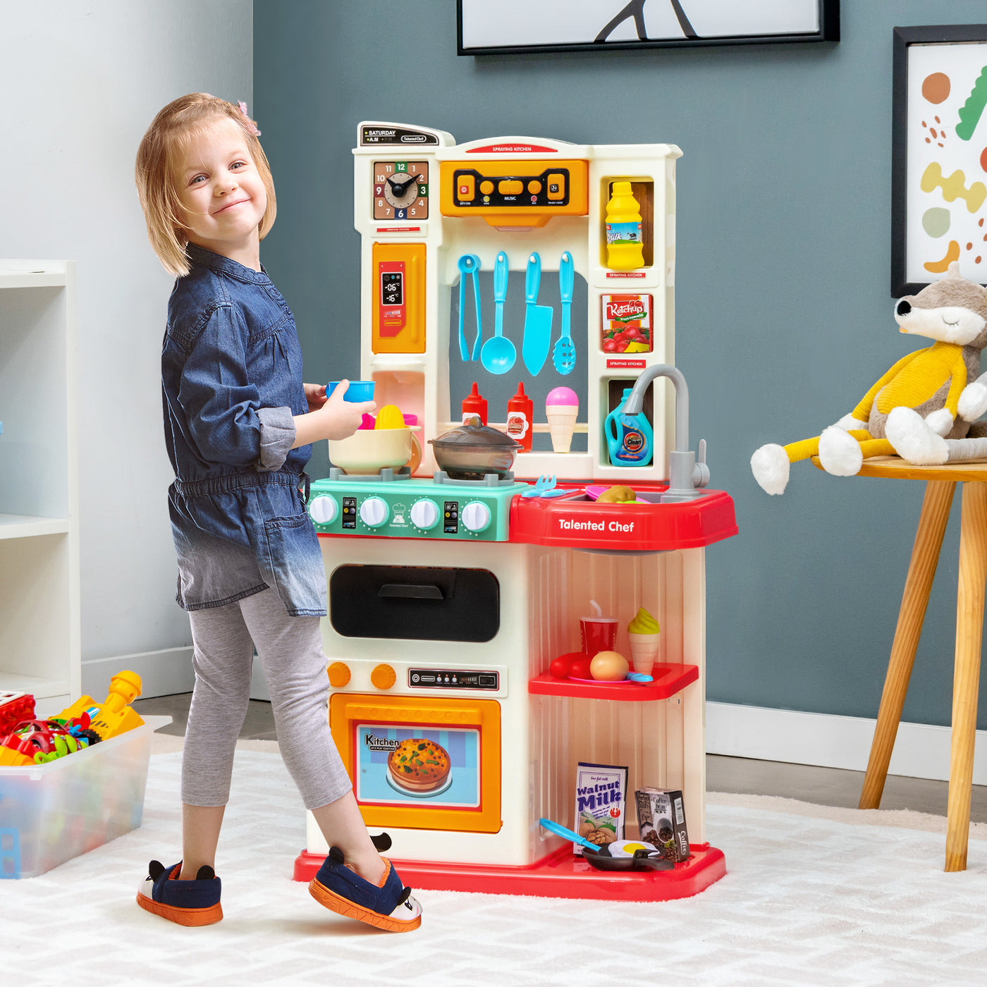 This kids’ kitchen packs 65 pcs of attractive accessories that include everything your kids need to enjoy the kitchen role play. This kitchen playset is loaded with real kitchen effects—the stoves are equipped with sound, smoke and lights while the water faucet discharges running water. And a multifunctional buzzing range hood has media buttons for kids to play music. This dream kitchen encourages kids to expand their imagination and creativity, improves their hand skills as well as social ability. It is an ideal gift designed for kids over 3 years old with an exquisite gift box. If you are looking for such a product, do not hesitate to buy it! All-in-One Pretend Kitchen Toy: The 65 pieces kids kitchen table includes play stove, cooking utensil, spray, play sink with running water, kinds of kitchen accessories, stickers and extra counter top space for setting dishes! Children can perform role-playing and stage different games, the experience is realistic and great fun. Realistic Stove Top with Lights and Sound: The electronic stovetop burner with working fire-inspired lights and sound cooktop adds to the role play fun! When the button is turned on, the burner will light up and produce a realistic cooking sound. When the food is cooked, the lid will have steam coming out. Water Circulation and Storage: After dinner, kids can pretend to wash the dishes in the sink using the rotatable faucet. The sink adopts a water circulation system to save water. Besides, children can easily remove their utensils from the hanging storage hooks. Also there are open storage shelves to store play food and accessories after playing. Educational Learning Toy: This kitchen toy has fun and interactive features that will spark your little chef's interest in cooking. By simulating the experience of a home chef, children will learn communication skills, improve independent thinking, and develop coordination skills. This stylish kitchen appliance is the perfect birthday party, Christmas, or holiday gift. Safe Material and Thought Design: Made of high-quality and safe plastic materials, accompanying your child healthy grow. The 79cm high children's kitchen is suitable for children over 3 years of age, so that children can play comfortably. Besides, the rounded corners definitely avoid scratching the children's skin.