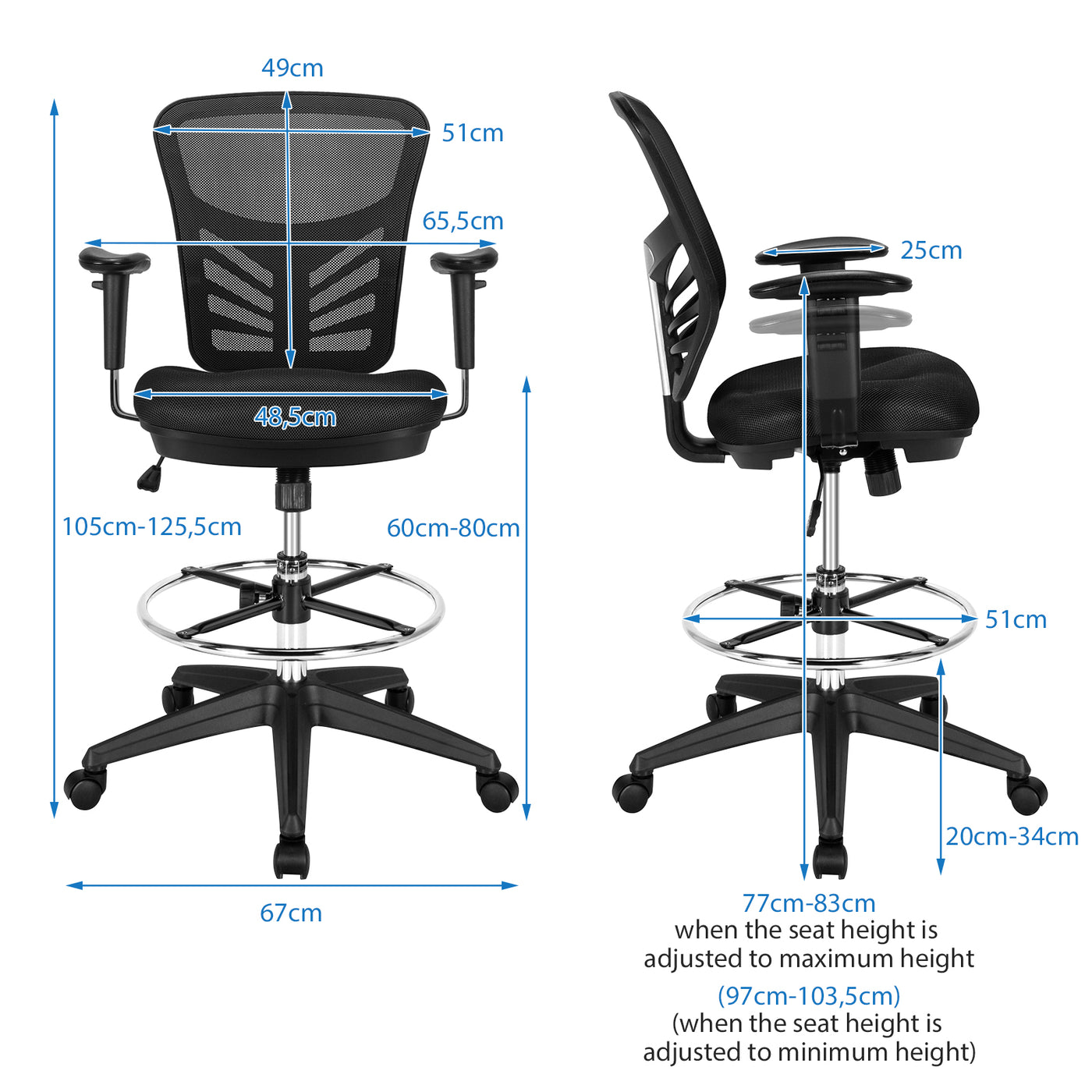 This fantastic comfortable drafting rolling stool chair is designed to bring your workday to new heights! Thanks to the high-class lever, you can quickly adjust the height of this chair to suit a standing desk, normal desk and a high table, which can be used as a drafting chair, bar stool, office chair, and game chair. The footrest and armrests with height adjustment relax your feet or arms in a comfortable position. The ergonomic backrest and lumbar support are combined with the human body curve to prevent physical fatigue during the long working day and achieve the maximum level of comfort. High density and breathable mesh back keep the air flowing for endless enjoyment. Thickened cushion is padded with a high elastic sponge to increase extra comfort. The silent casters and 360°swivel design allow you to enjoy full mobility and flexibility in the office or at home. The sturdy base with a superior class-4 gas lift performs well in sturdiness, safety and durability. Have a comfortable and relaxing working day with this ergonomic mid-back drafting chair. If you are looking for such a product, do not hesitate to take it to your home! Flexible Height Setting and Adjustable Footrest: By lifting a convenient lever under the seat, you can adjust the seat height of mesh drafting chair from 60 to 80cm for your multi-tasking work and tables of different heights. You can also adjust the height of the foot ring and armrests to get a healthy sitting posture. Ergonomic Design for Added Comfort: This mid-back home office chair features a form-fitted ventilated mesh back and built-in lumbar support, which helps you take pressure off your back for all-day comfort. Additionally, an ample sponge-padded contoured seat supports your legs and gives you a feeling of relaxation. High-Density Cushion and Breathable Mesh: Made of high-quality breathable and skin-friendly mesh, the back and seat promote air circulation for a cool experience while working or studying. 10cm thick cushion is filled with a highly resilient sponge to ensure long-lasting service life and provide increased comfort. Heavy Duty Base and Premium Gas Lift: Ultra-sturdy 5-claw base of the swivel desk chair is strong and durable enough to withstand a maximum load of 120kg and prolong longevity. Besides, the SGS-tested certified class-4 gas lift offers additional security and protection for you and your family. 360° Swivel Design and Wide Application: Flexible casters guarantee gliding over the different surface for easy mobility without scratches. Besides, it is more convenient for you to discuss with your teammates due to the 360°swivel design. The combination of chic style and exceptional functionality makes this executive task chair suitable for working, studying and drafting.