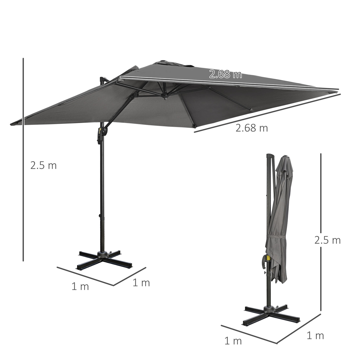 Outsunny 2.7 x 2.7 m Cantilever Parasol, Square Overhanging Umbrella with Cross Base, Crank Handle, Tilt, 360° Rotation and Aluminium Frame, Dark Grey - Dark Grey