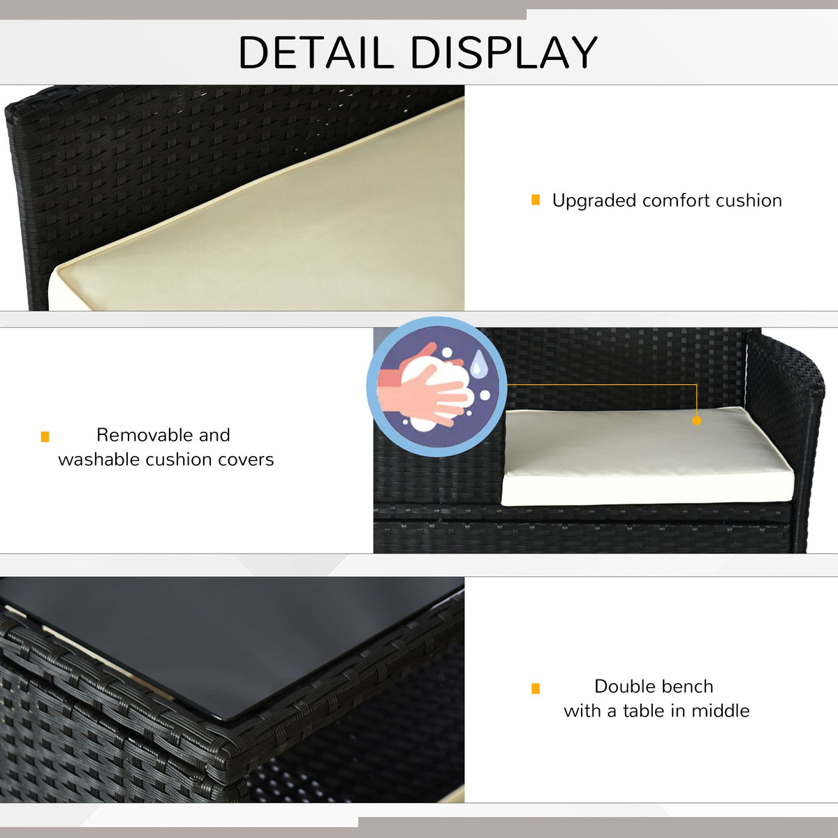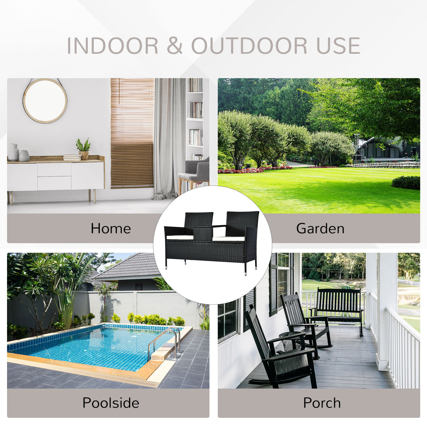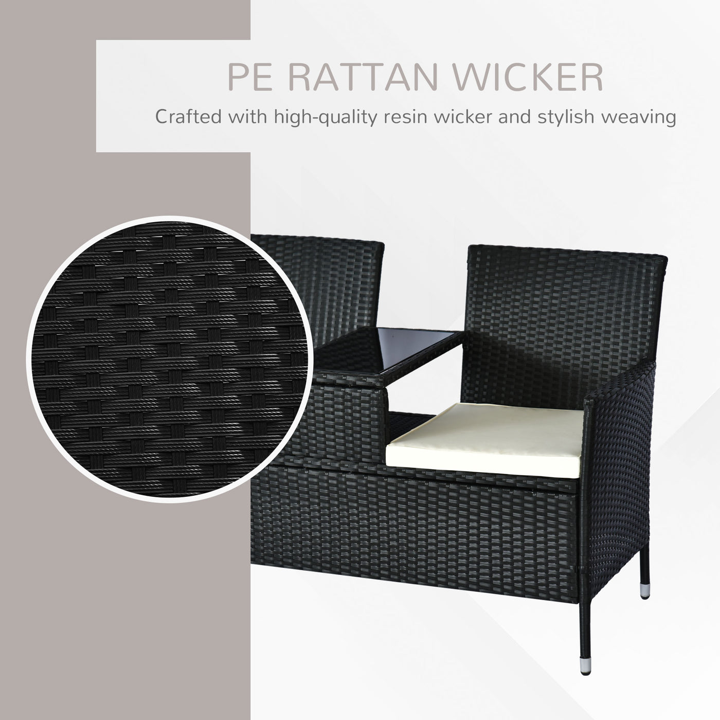 Outsunny 2 Seater Rattan Campanion Chair Wicker Loveseat Outdoor Patio Armchair with Drink Table Garden Furniture - Black - Black