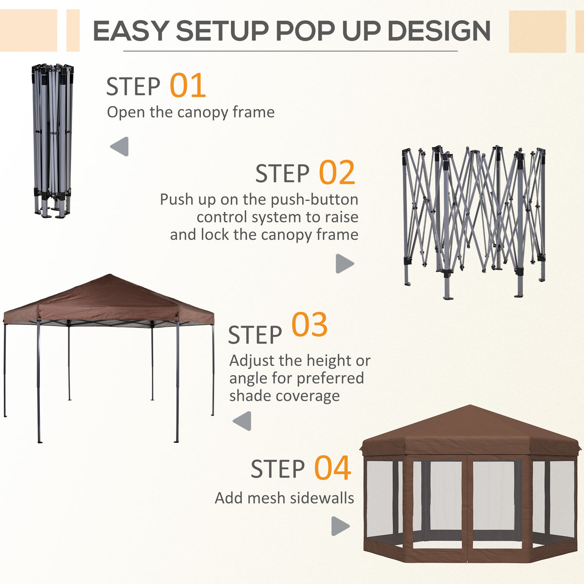 Outsunny 3.5m x 4m Hexagonal Pop Up Gazebo, Canopy Tent Sun Shelter for Patio Outdoor Party, Height Adjustable, with Mosquito Netting and Carry Bag - Brown - Brown
