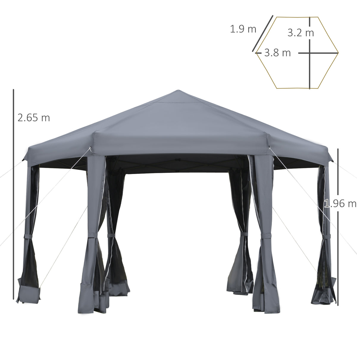Outsunny 3.8m x 3.2m Pop Up Gazebo Hexagonal Canopy Tent Outdoor Sun Protection with 6 Mesh Sidewalls, Hand Bag, Grey - Grey