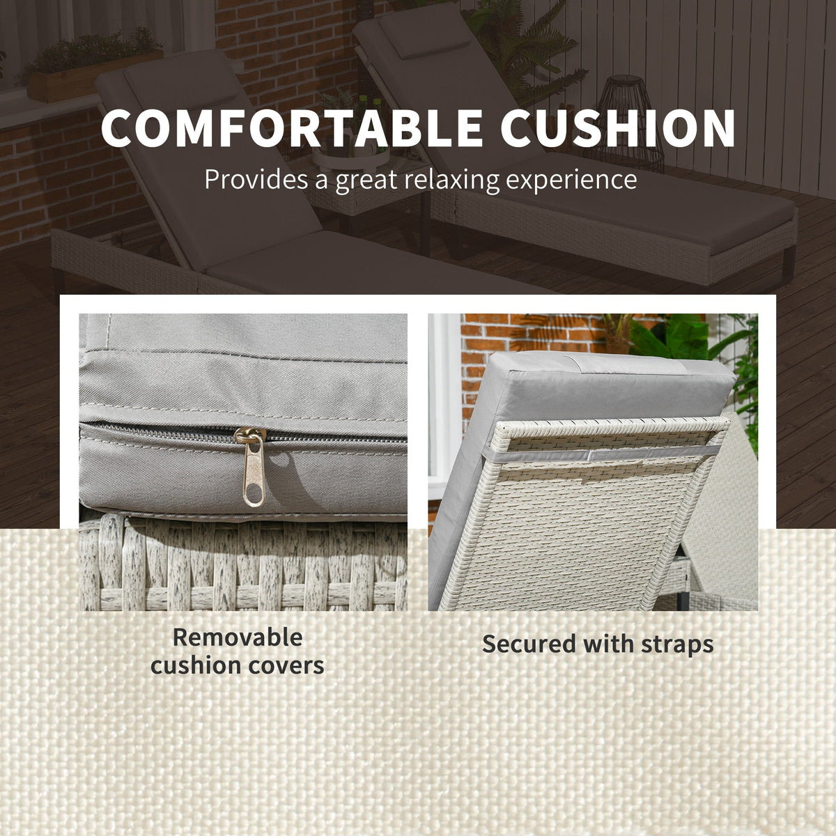 Outsunny 3-piece PE Rattan Sun Lounger Set with Adjustable 5-Position Recliner, Patio Chaise Lounge Chair Set with Cushions, Headrests, Glass Top Square Coffee Table, Light Grey - Light Grey