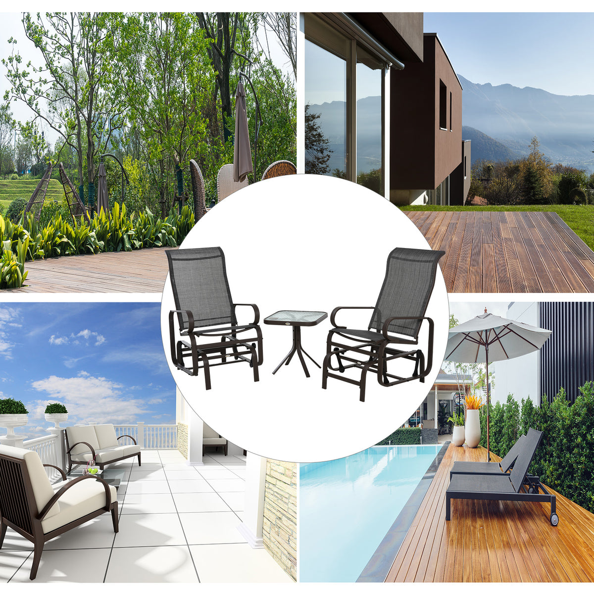 Outsunny 3 Pieces Garden Gliding Chair Set, Metal Frame 2 Single Armchair Swing Seater and 1 Glass Top Coffee Table w/ Breath Mesh Fabric Seat, Brown - Brown