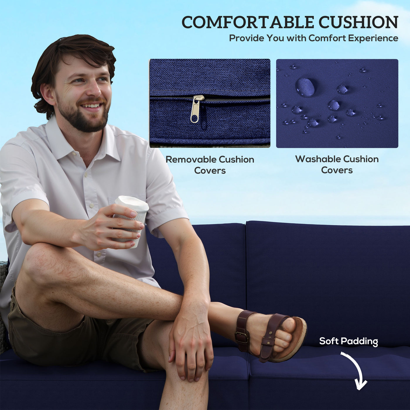 Outsunny 3 Pieces PE Rattan Garden Furniture Set with 10 cm Thick Cushions, 4 Seater Garden Corner Sofa Set with Glass Top Coffee Table, Outdoor Furniture for Patio, Porch, Blue - Blue