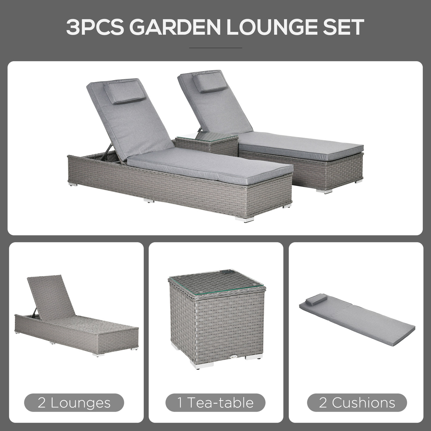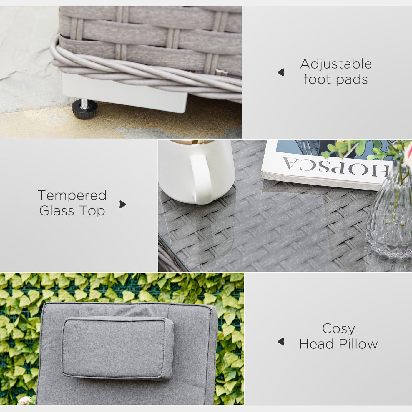 Outsunny 3 Pieces Rattan Sun Lounger Set with Aluminium Frame, 5-Position Adjustable Reclining Garden Chairs and Glass Top Table, Wicker Garden Furniture Daybed with Cushions for Patio, Grey - Grey