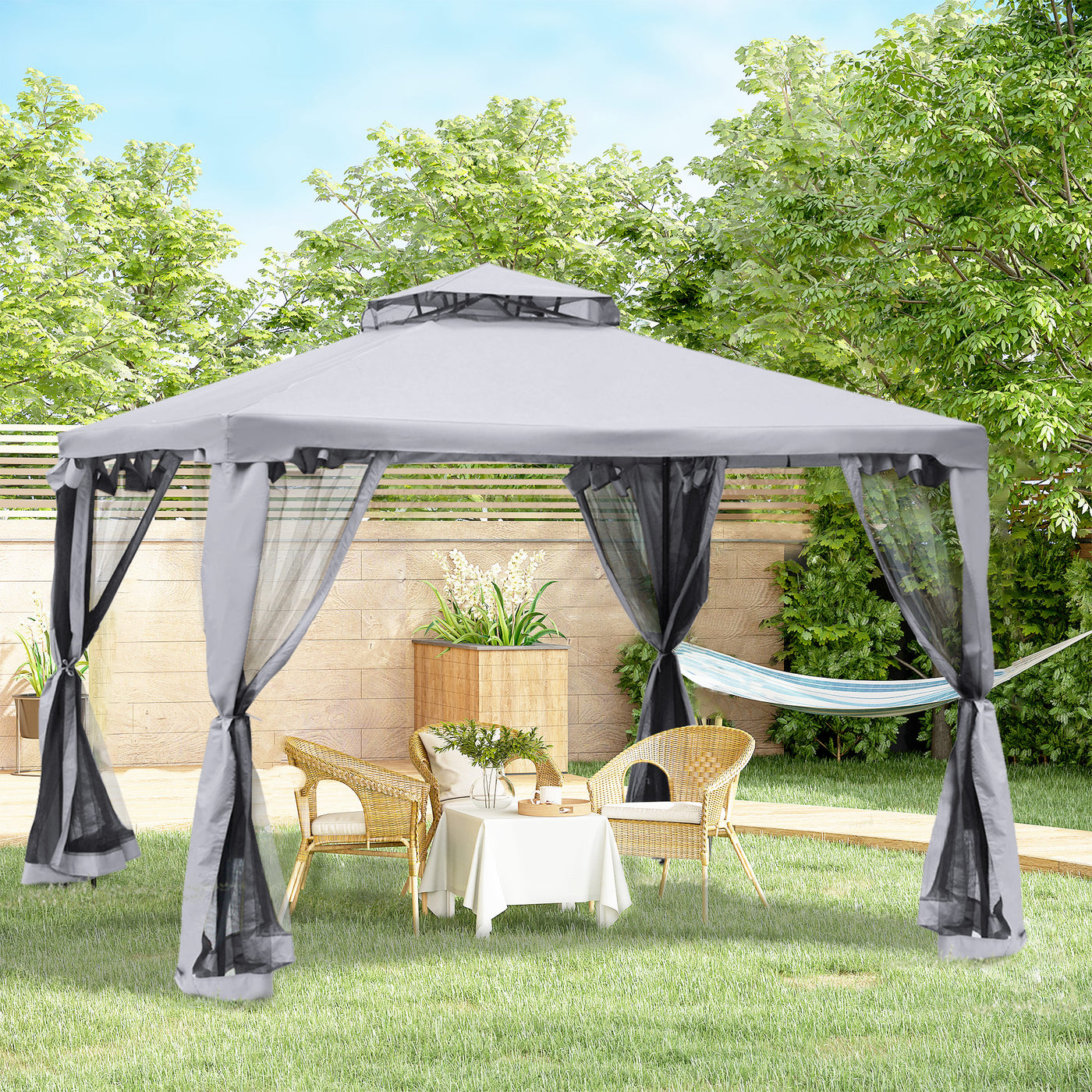 Outsunny 3 x 3 m Metal Gazebo, Garden Pavillion, Double Roof Outdoor Canopy Shelter with Mesh Sidewalls, Grey - Grey