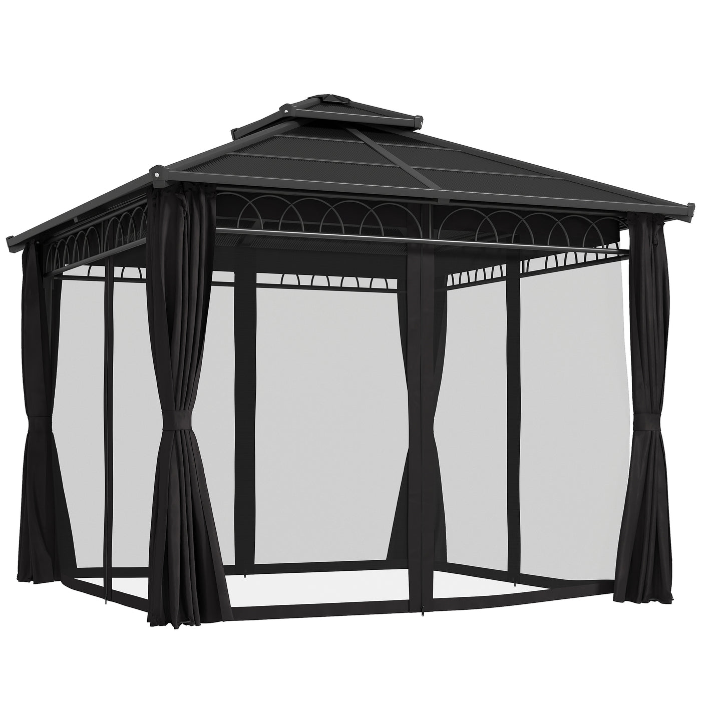 Outsunny 3 x 3 (m) Outdoor Polycarbonate Gazebo, Double Roof Hard Top Gazebo with Galvanised Steel Frame, Nettings & Curtains for Garden, Lawn, Patio and Deck, Dark Grey - Black, Dark Grey