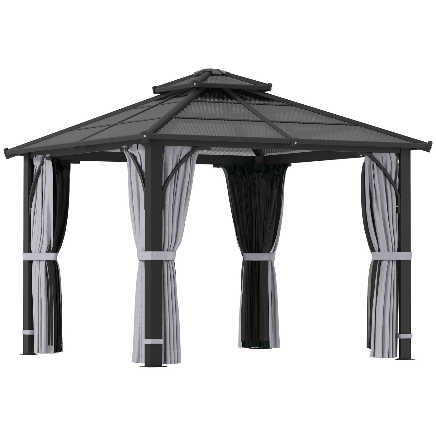 Outsunny 3 x 3(m) Hardtop Gazebo Canopy with 7mm Double Polycarbonate Roof, Garden Gazebo Permanent Pavilion with Mosquito Netting and Curtains for Patio, Deck, Dark Grey - Grey