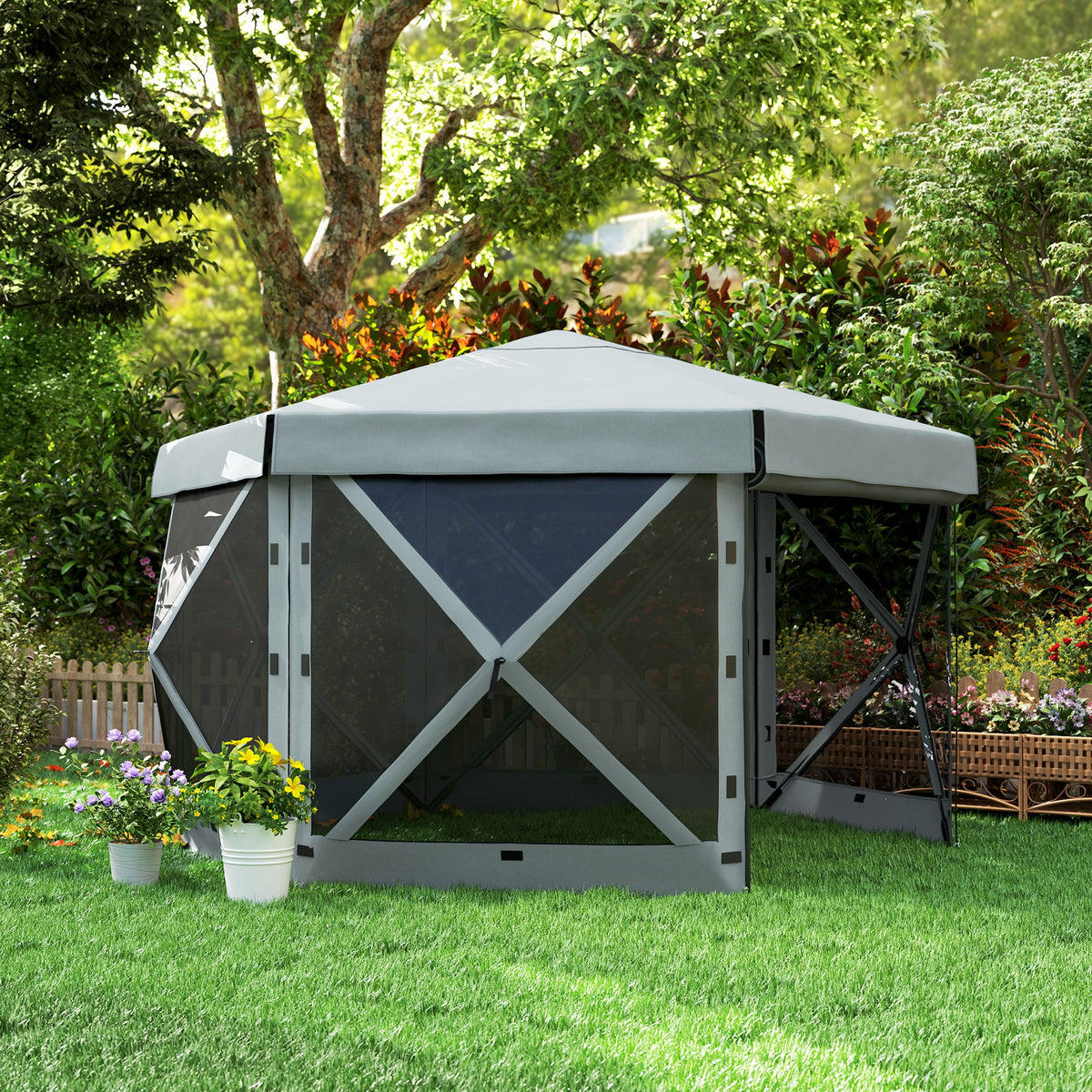 Outsunny 3 x 3(m) Hexagon Pop Up Gazebo with 5 Sides and Carry Bag, Waterproof, UV Resistant Party Tent Instant Event Shelter with Netting for Garden, Patio, Light Grey - Light Grey