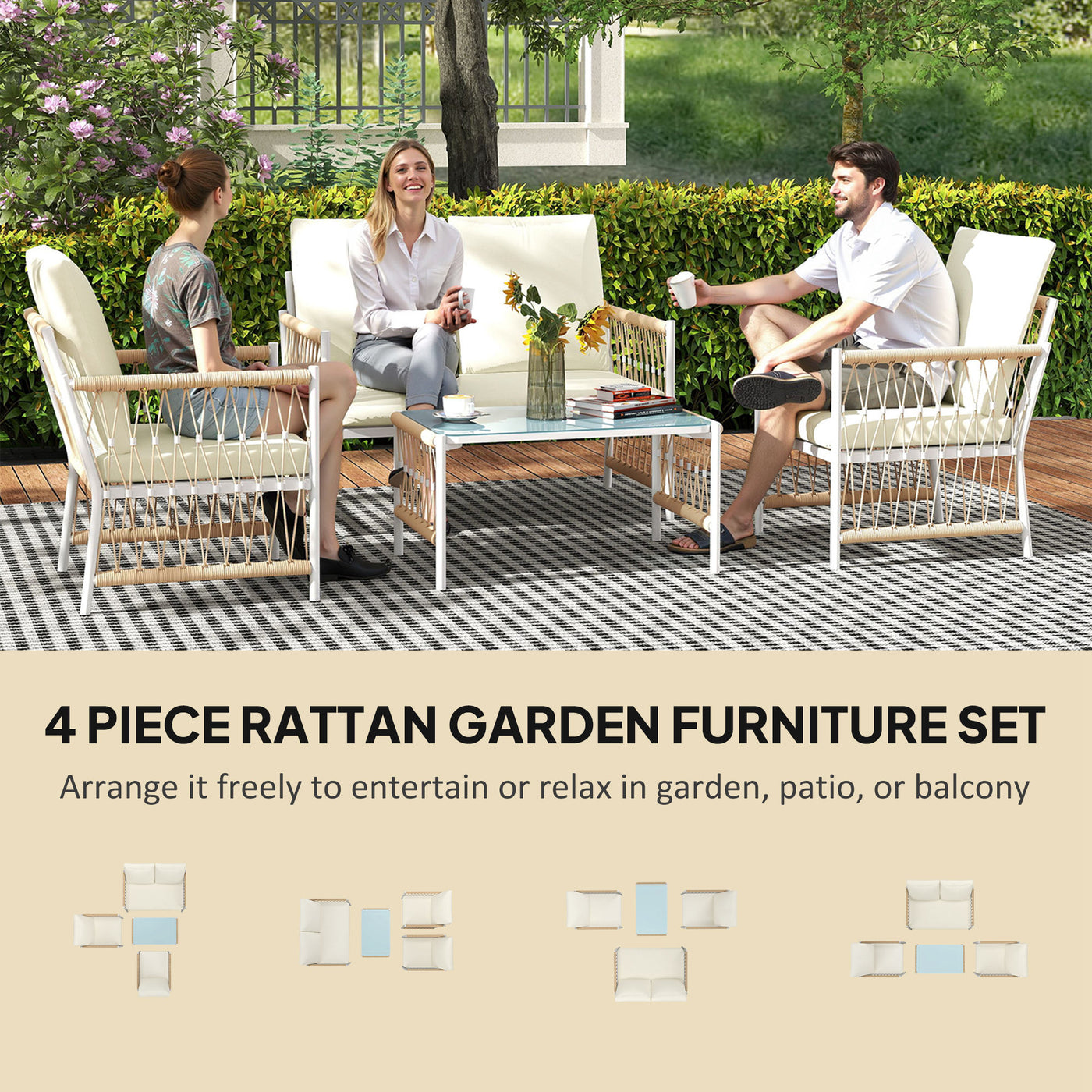 Outsunny 4 Piece Rattan Garden Furniture Set, 4 Seater Wicker Patio Conversation Set with 2 Armchairs, Loveseat, Glass Top Coffee Table and Cushions for Outdoor, Balcony, Khaki - Khaki