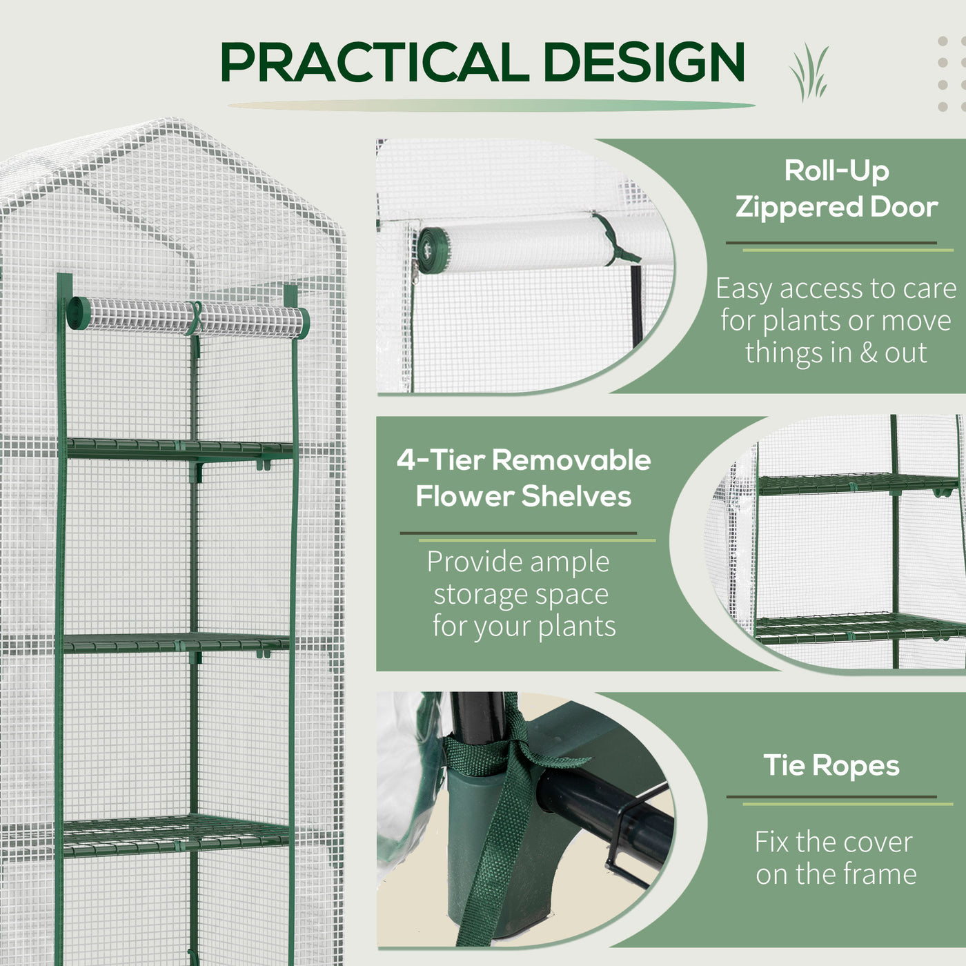 Outsunny 4 Tier Mini Greenhouse, Portable Compact Green House with Steel Frame, PE Cover, Roll-up Door, 70 x 50 x 160 cm, White - White